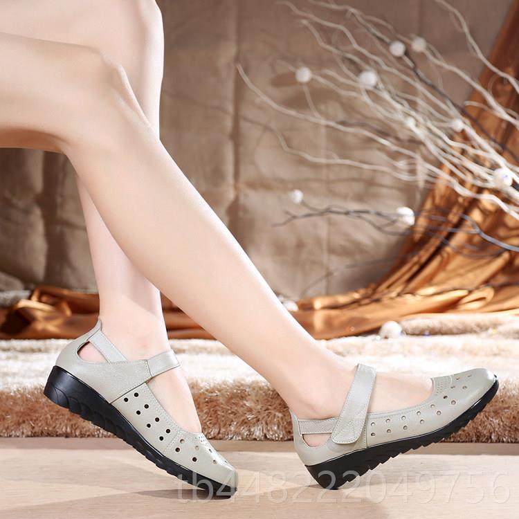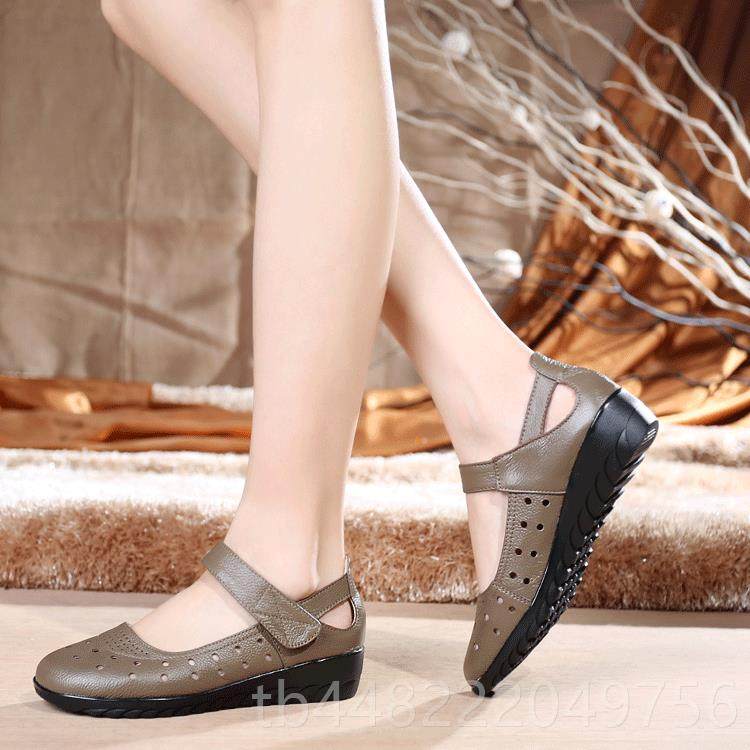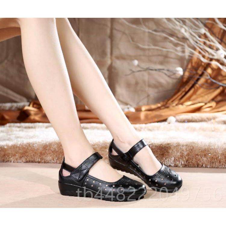 正品空夏小码妈妈鞋凉鞋真滑皮防坡跟单鞋女季鞋中老年皮鞋镂洞洞