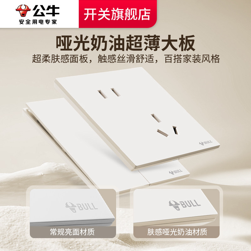 公牛蝶翼超薄g57米绒白肤感开关五孔插座16a哑光奶油风米绒白新品