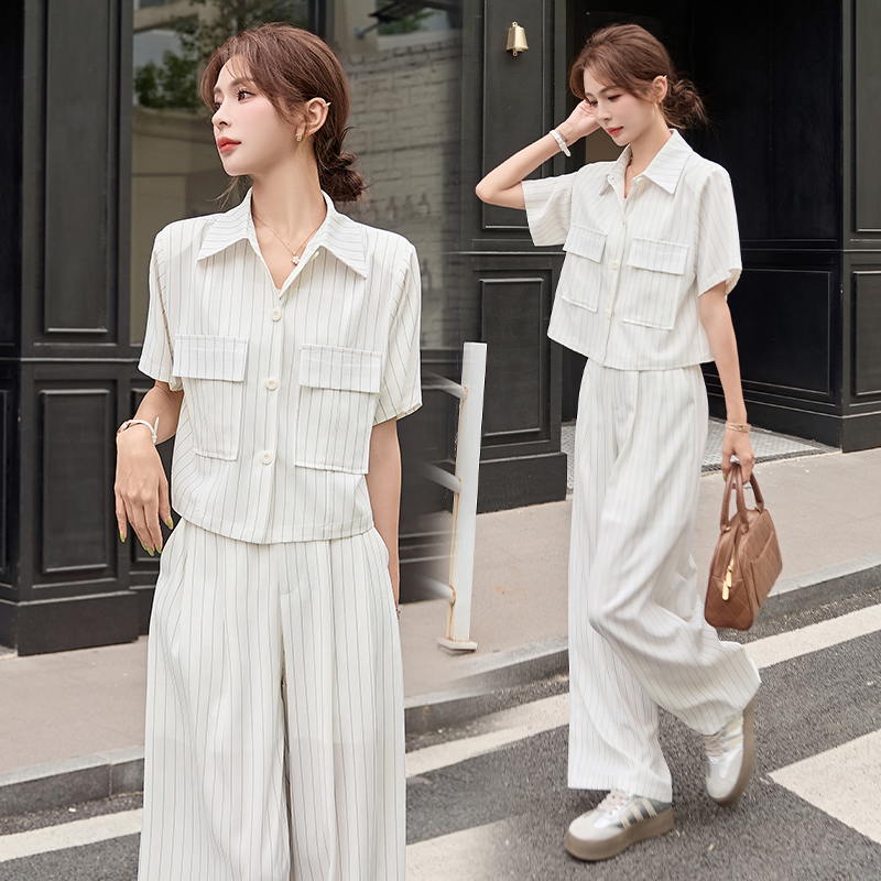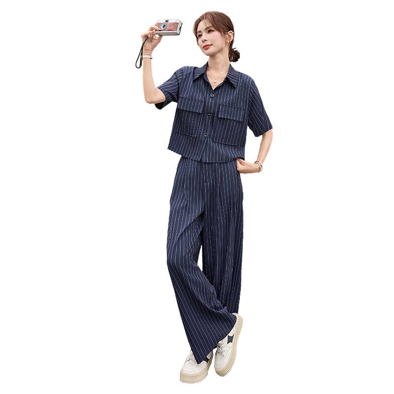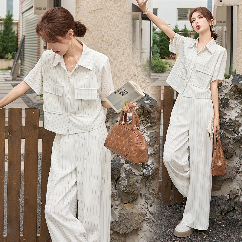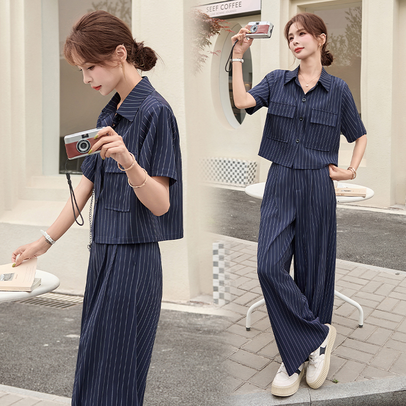 休闲时尚条纹套装女2025夏新款高级感宽松巨好看职业阔腿裤两件套