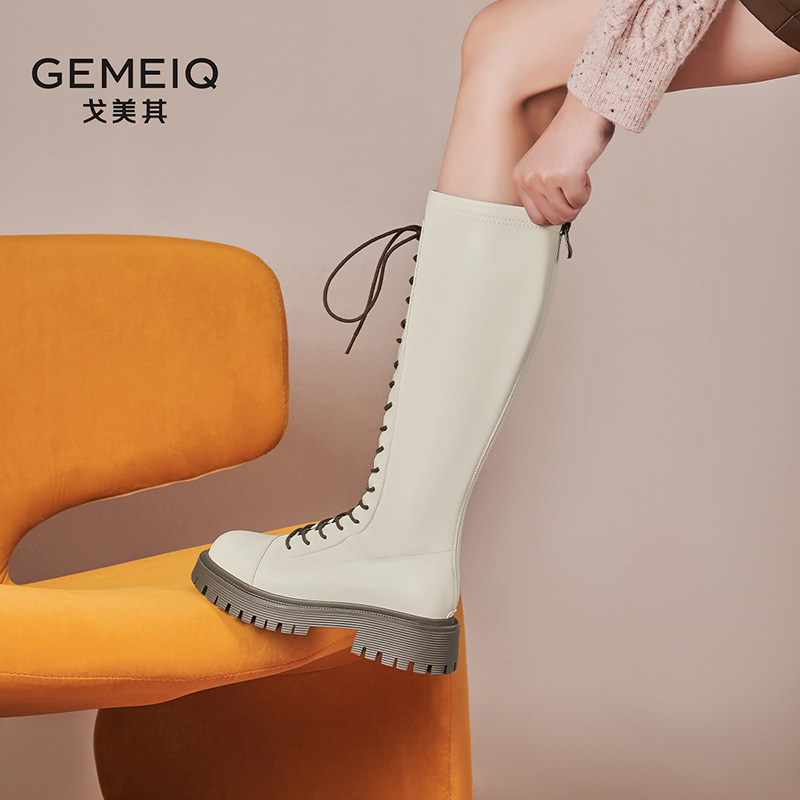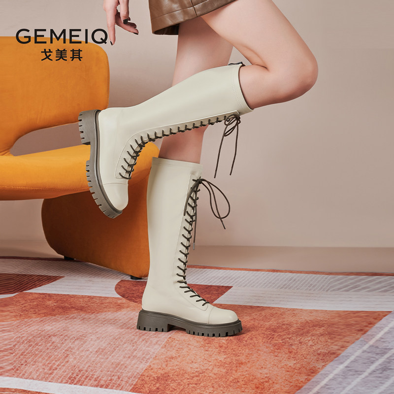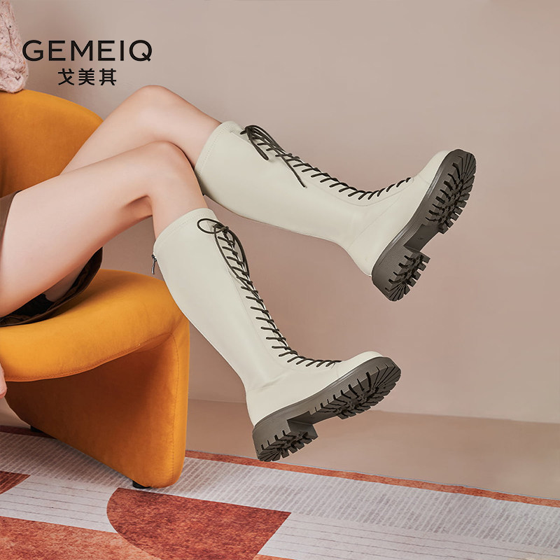 戈美其长筒靴女舒适春季新款黑色高筒靴绑带骑士靴瘦瘦靴马丁长靴