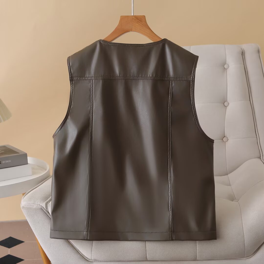大码25秋新款时尚复古高级感圆领pu皮马甲开衫女洋气无袖背心上衣