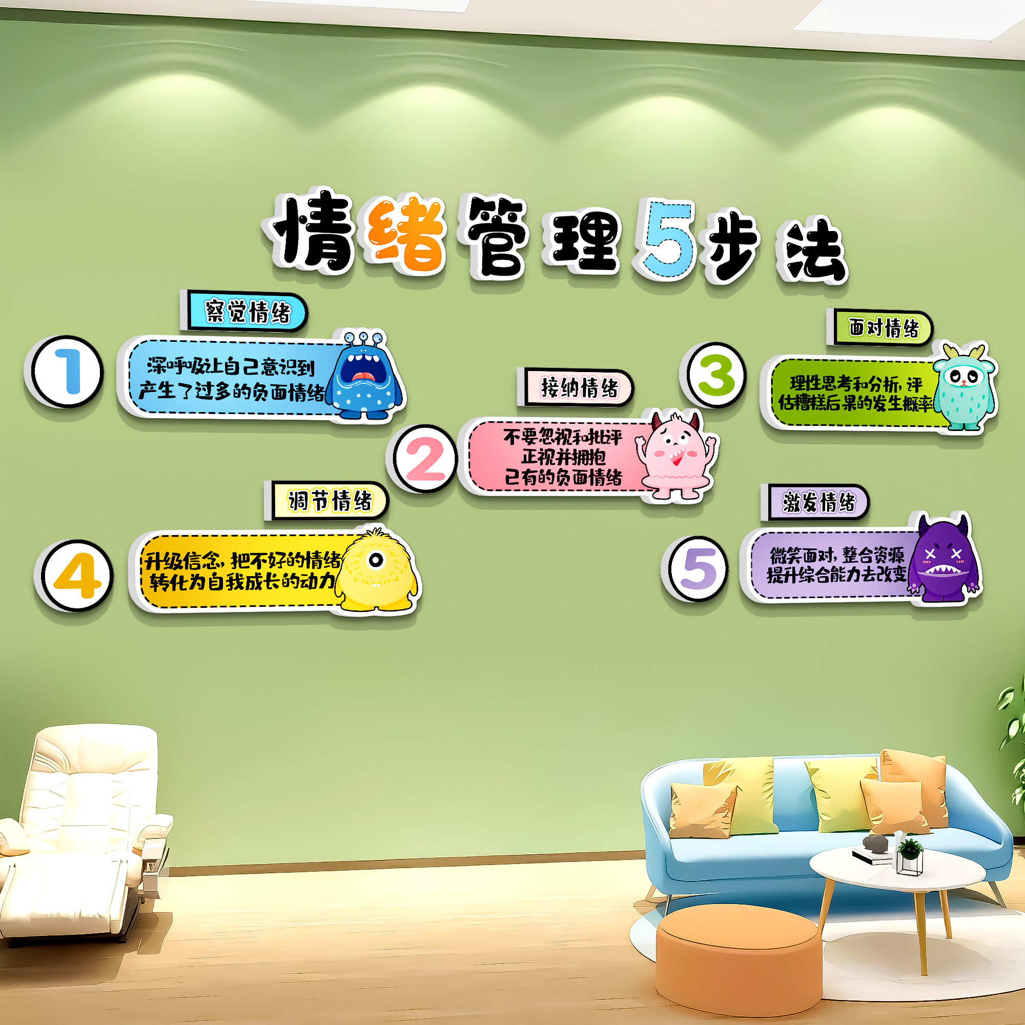 心理角咨询室布置健康文化墙贴纸幼儿园童情绪管理小怪兽装饰挂画