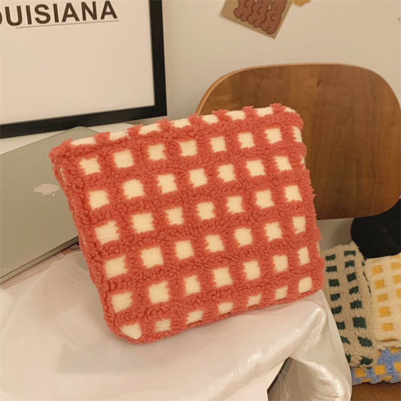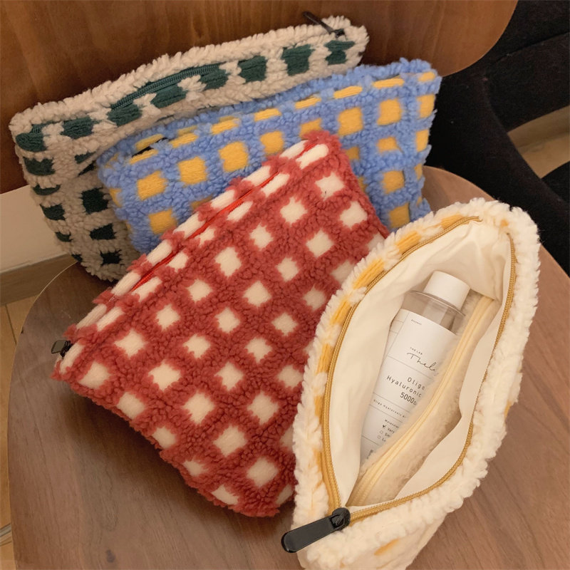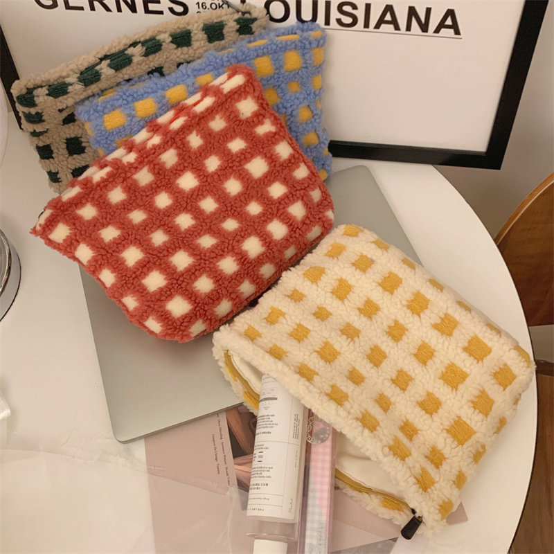 华夫格毛绒撞色化妆包杂物收纳袋