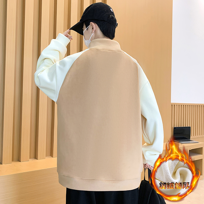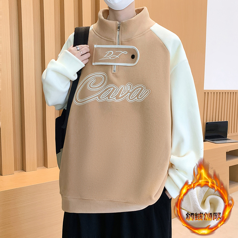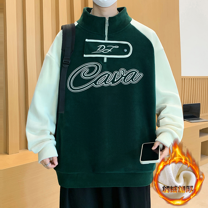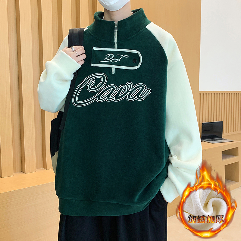 秋冬季新款青少年加绒加厚卫衣领口设计感半高领拼色潮流男生上衣