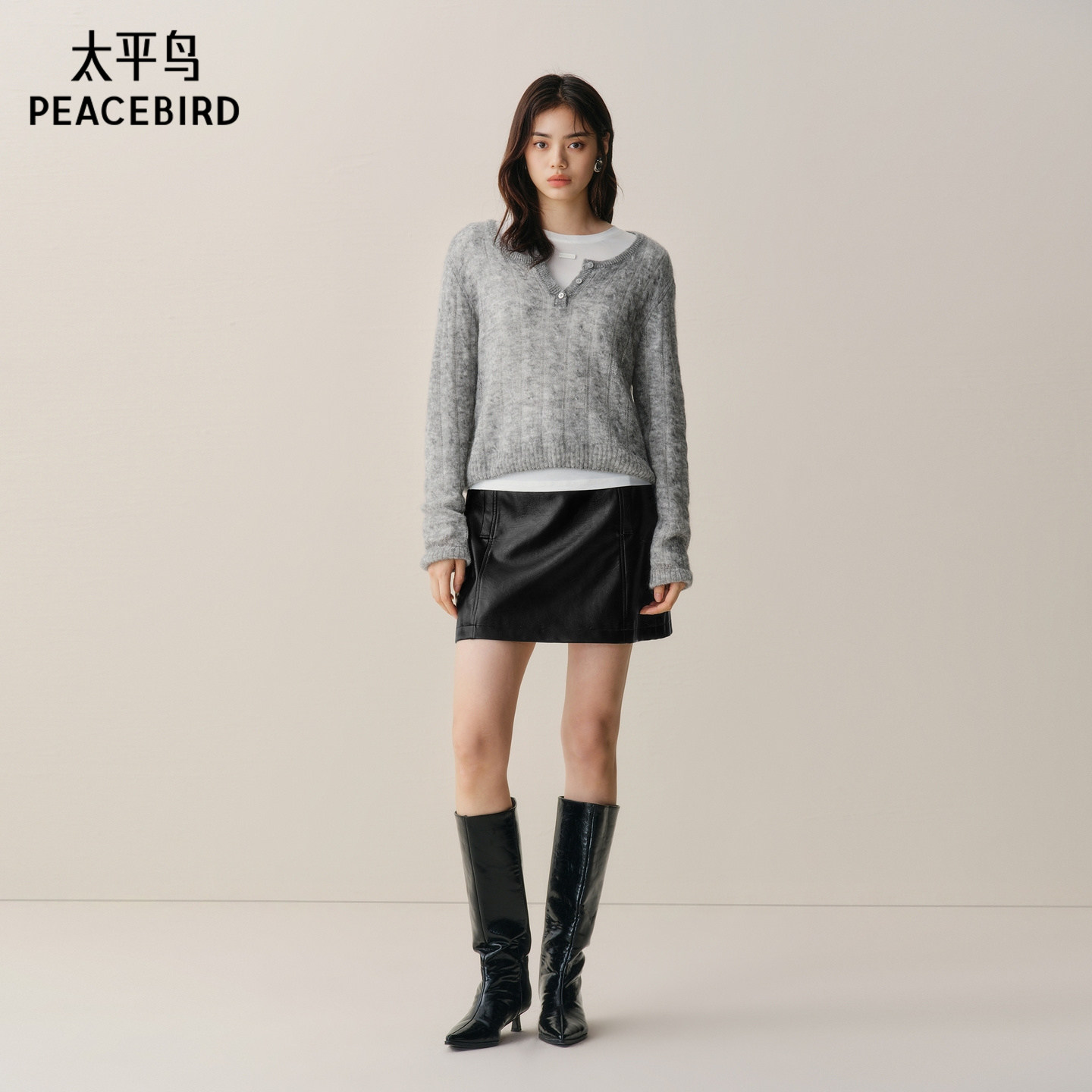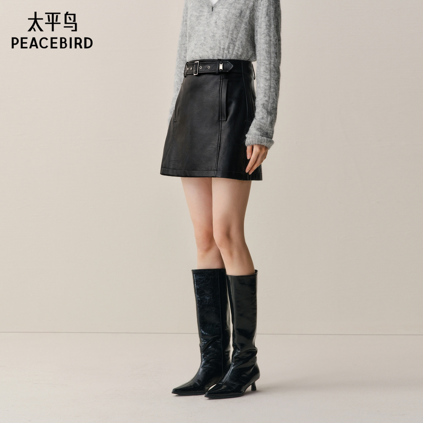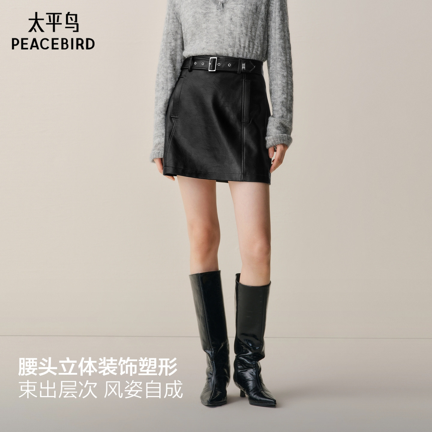 太平鸟黑色PU皮半身裙短裙2025年新款A字裙同材质腰带品质感短裙