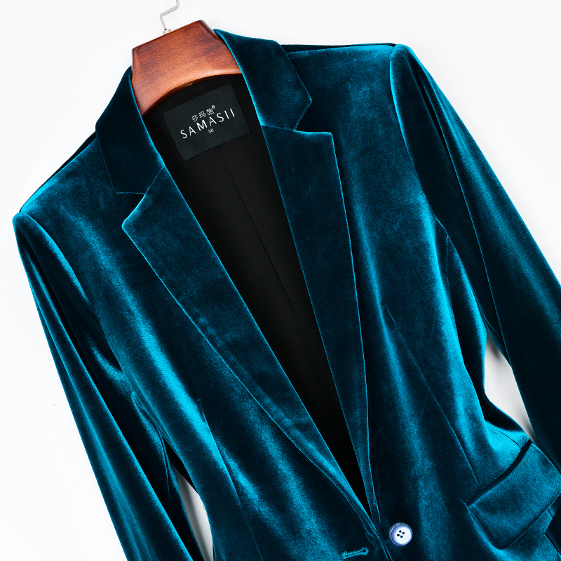 春装新款孔雀蓝金丝绒时尚修身单西装百搭通勤大码职业套装西服女