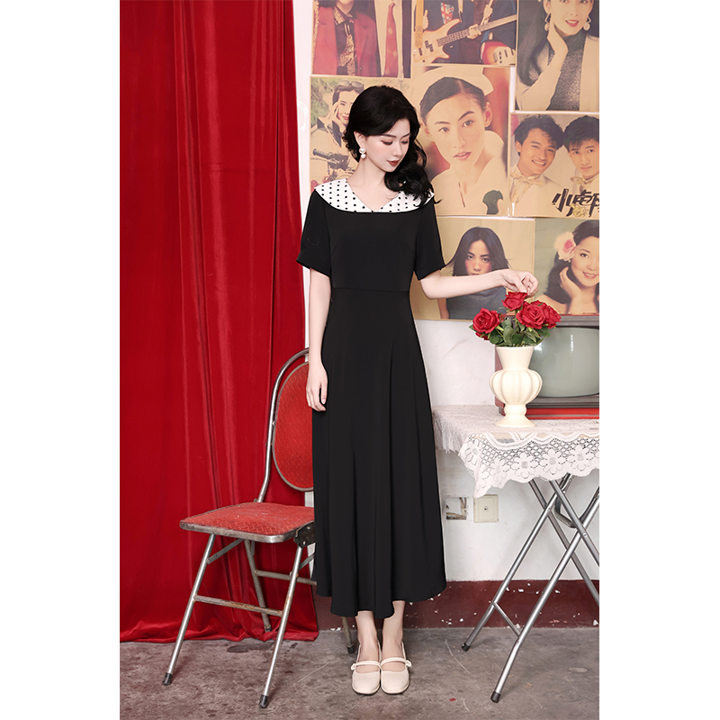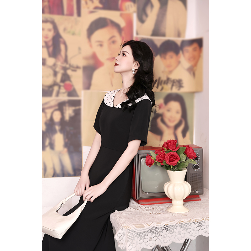 珍珠小姐~法式复古夏季短袖气质简约黑白拼接收腰中长款连衣裙