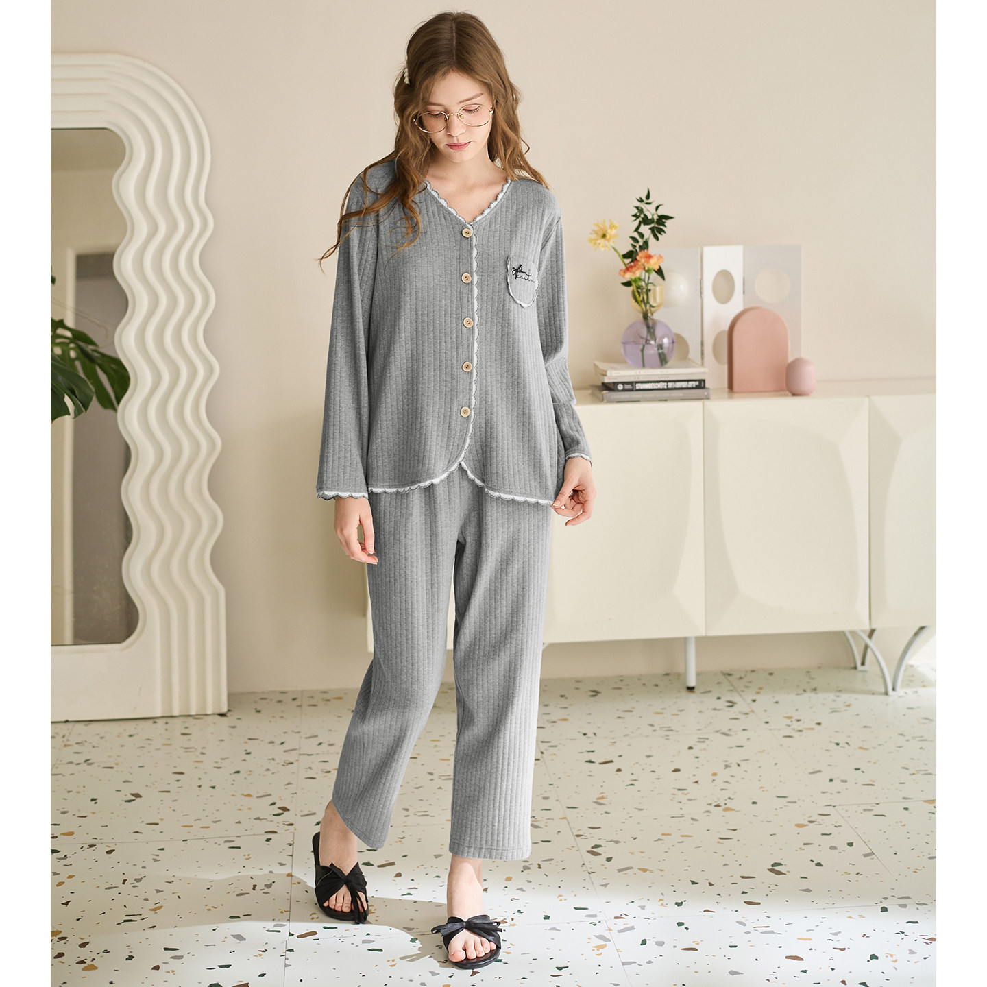 芬腾纯棉睡衣女春秋季婴儿棉开衫V领长袖套装简约休闲舒适家居服