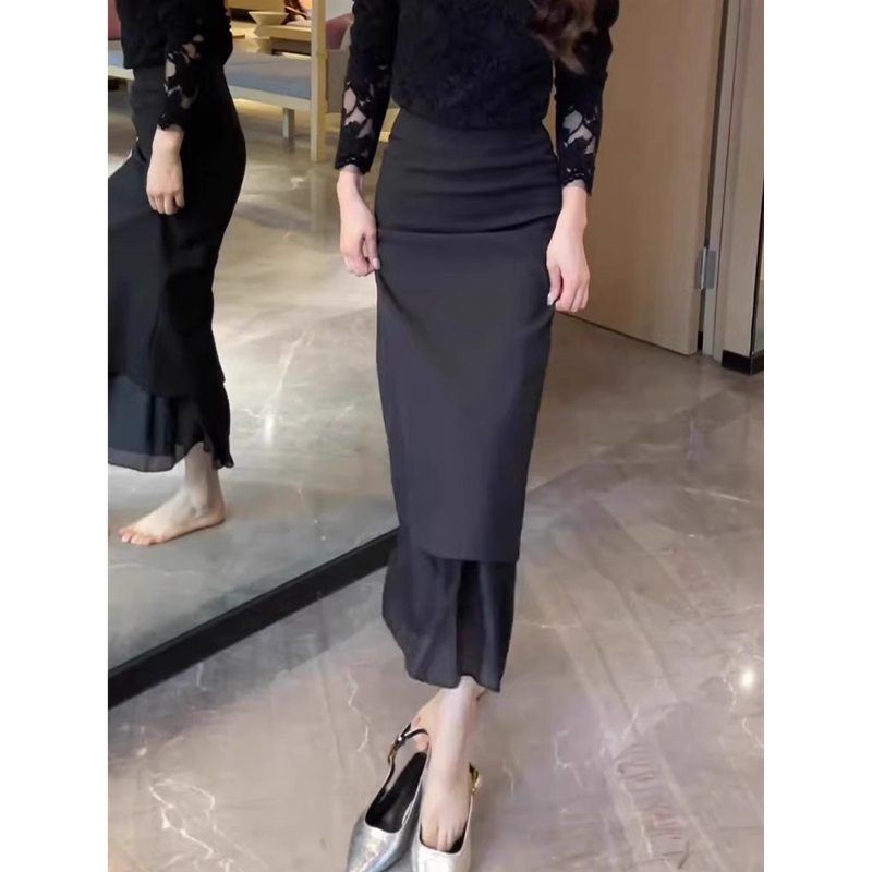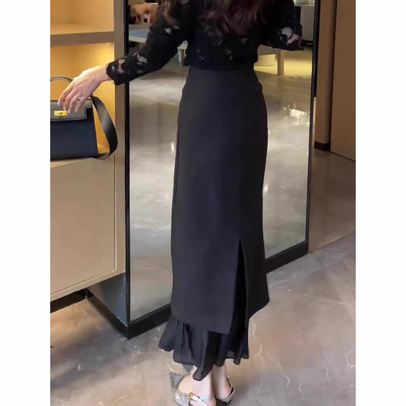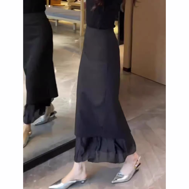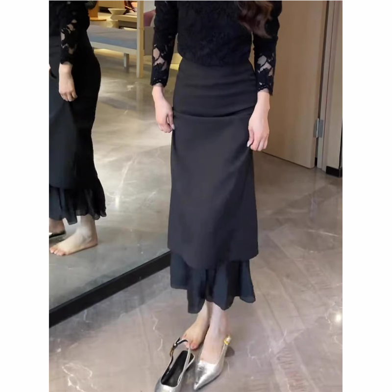 韩系黑色蕾丝拼接半身裙女2025夏季新款高级感百搭气质包臀长裙