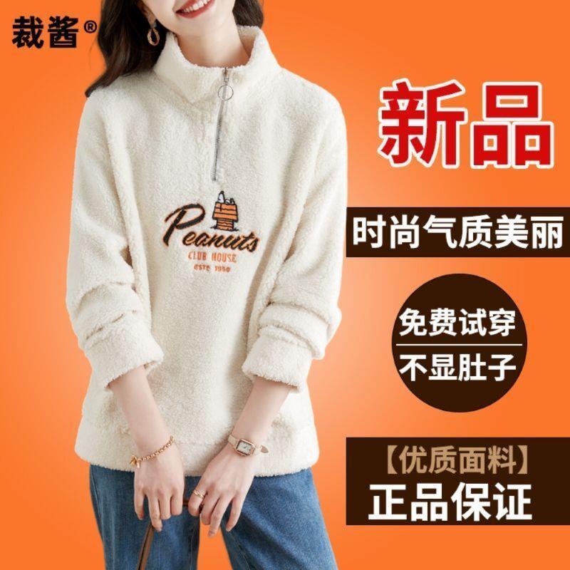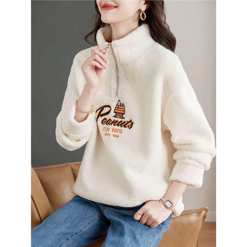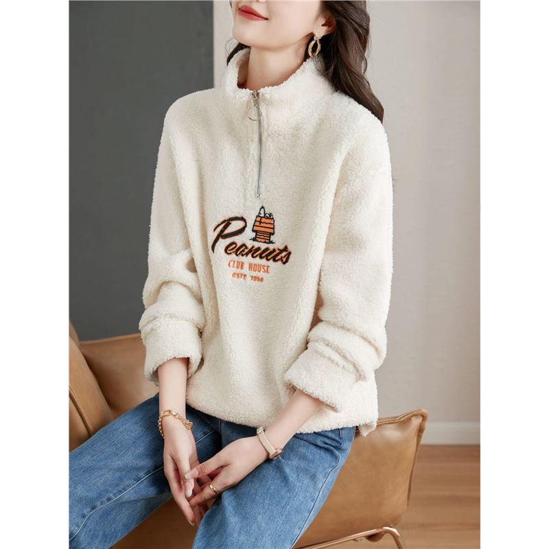 加绒加厚宽松羊羔毛卫衣女装2025秋冬字母百搭高领学生上衣外套