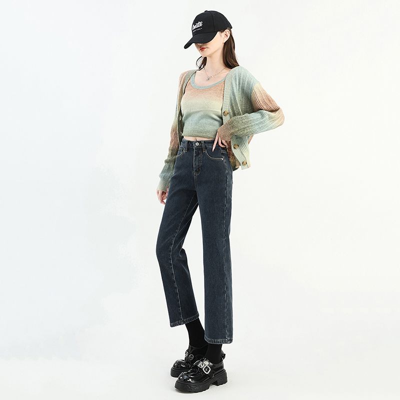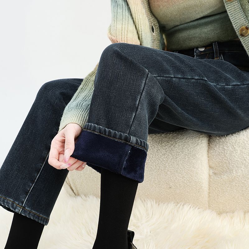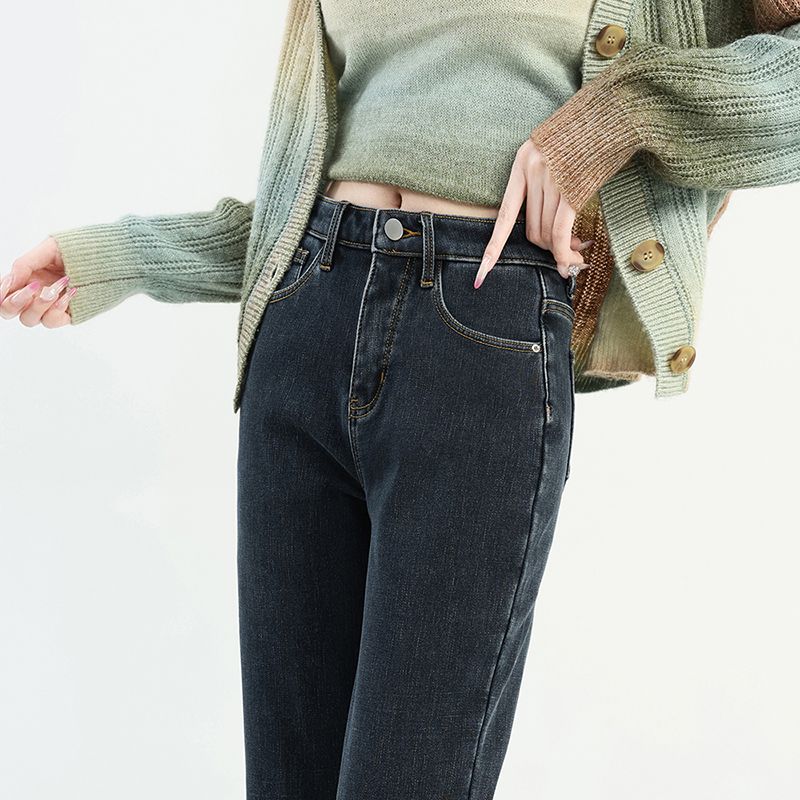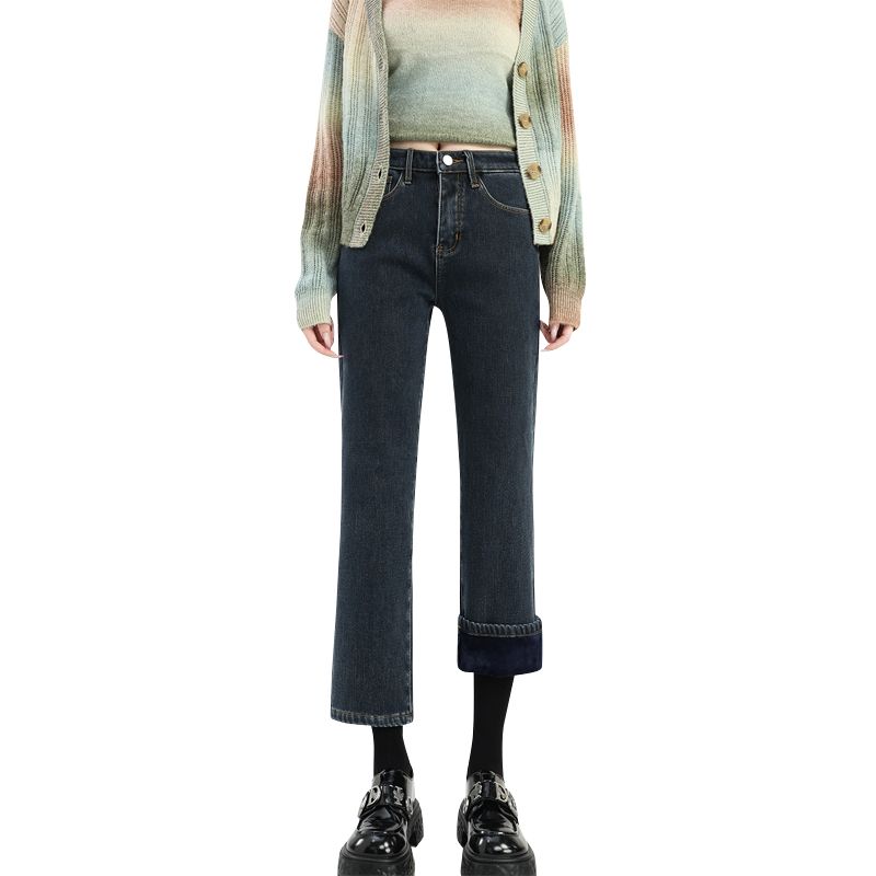 蓝灰加绒高腰弹力女2025冬季新款直筒烟管牛仔裤修身九分八分裤