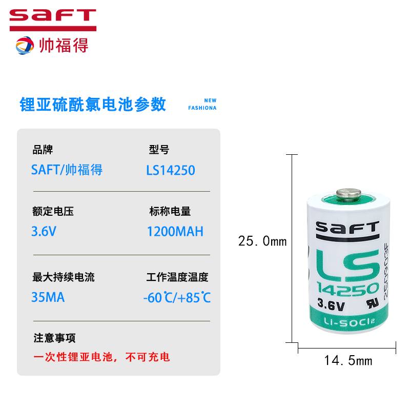 SAFT帅福得LS14250锂电池3.6V工控伺服PLC编程器数控机器人温控器