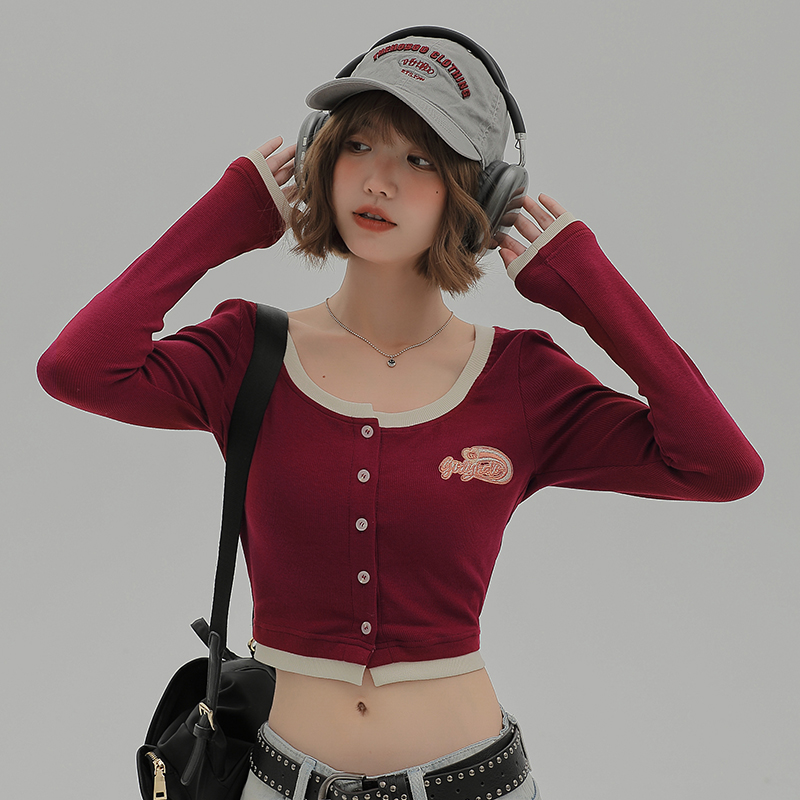 Girlyhalo美式复古假两件针织衫女秋季短款设计感t恤长袖辣妹上衣