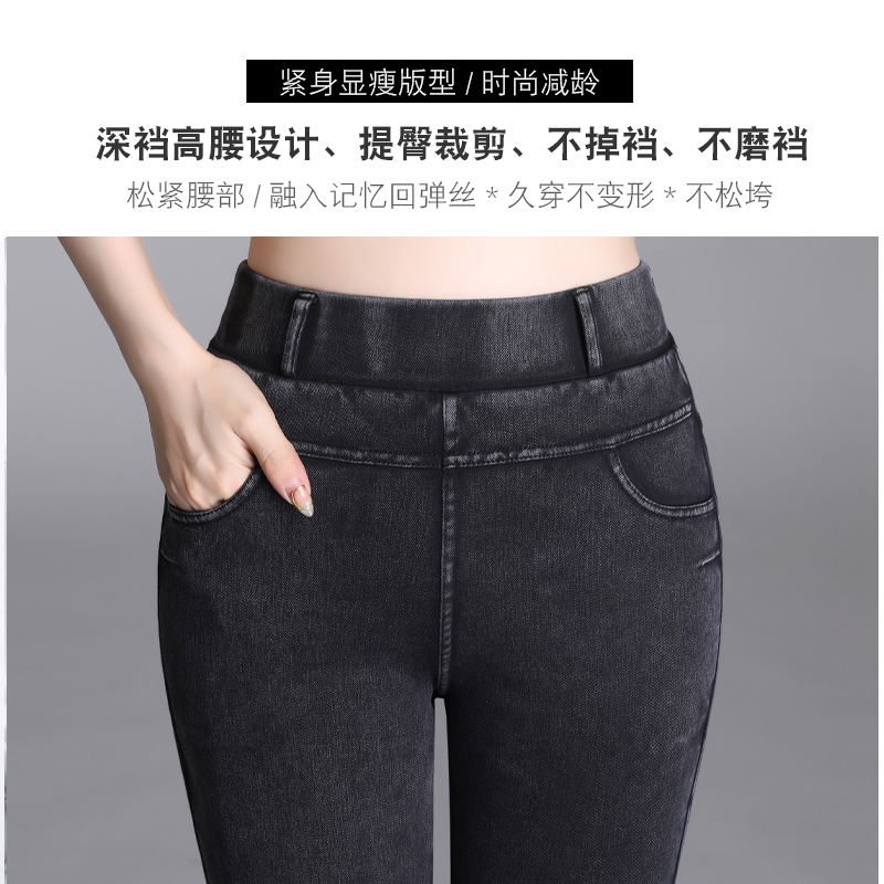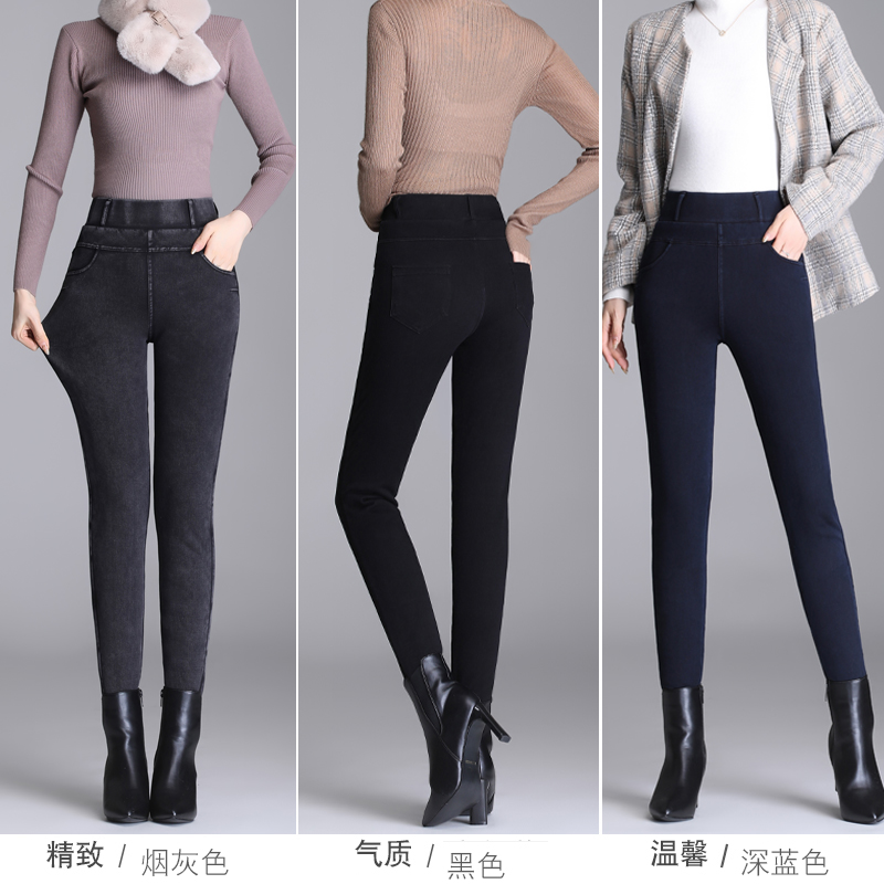 松紧腰加绒牛仔裤女高腰加厚加棉