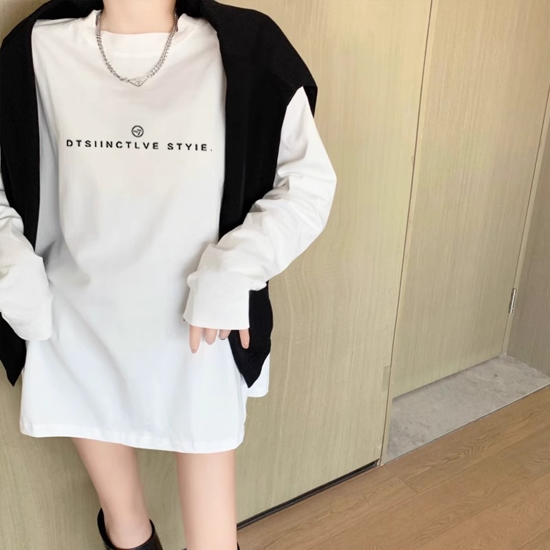 慵懒风黑色长袖t恤女秋冬新款宽松时尚中长款加绒上衣纯棉打底衫