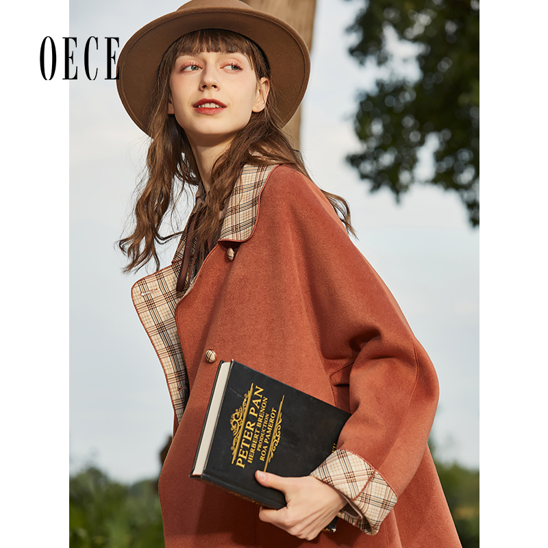 Oece复古毛呢外套冬双排扣中长款格子气质呢子大衣女