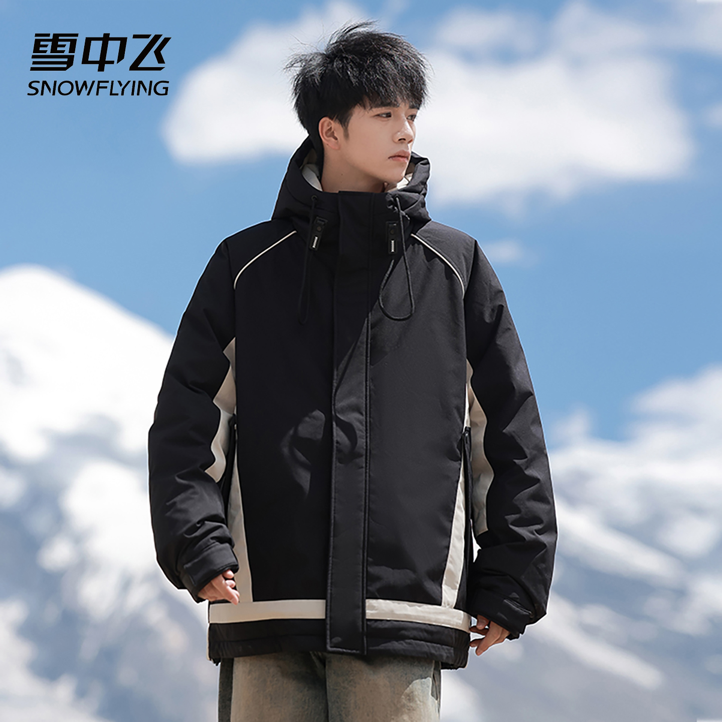 雪中飞 SNOWFLYING 品牌logo撞色条纹简约抗寒防风保暖连帽羽绒服