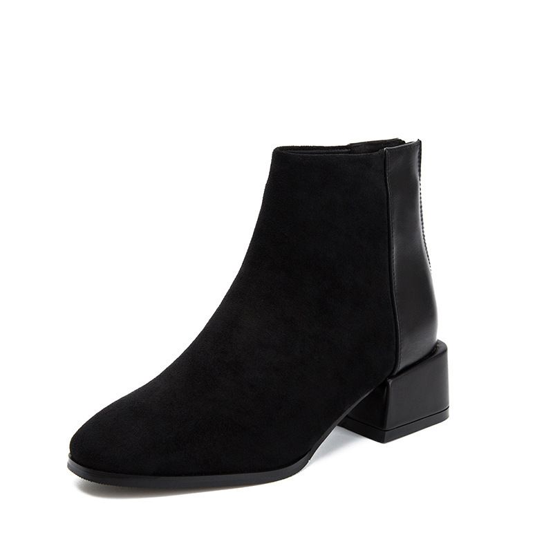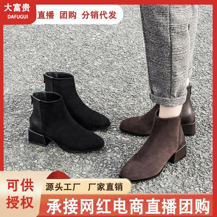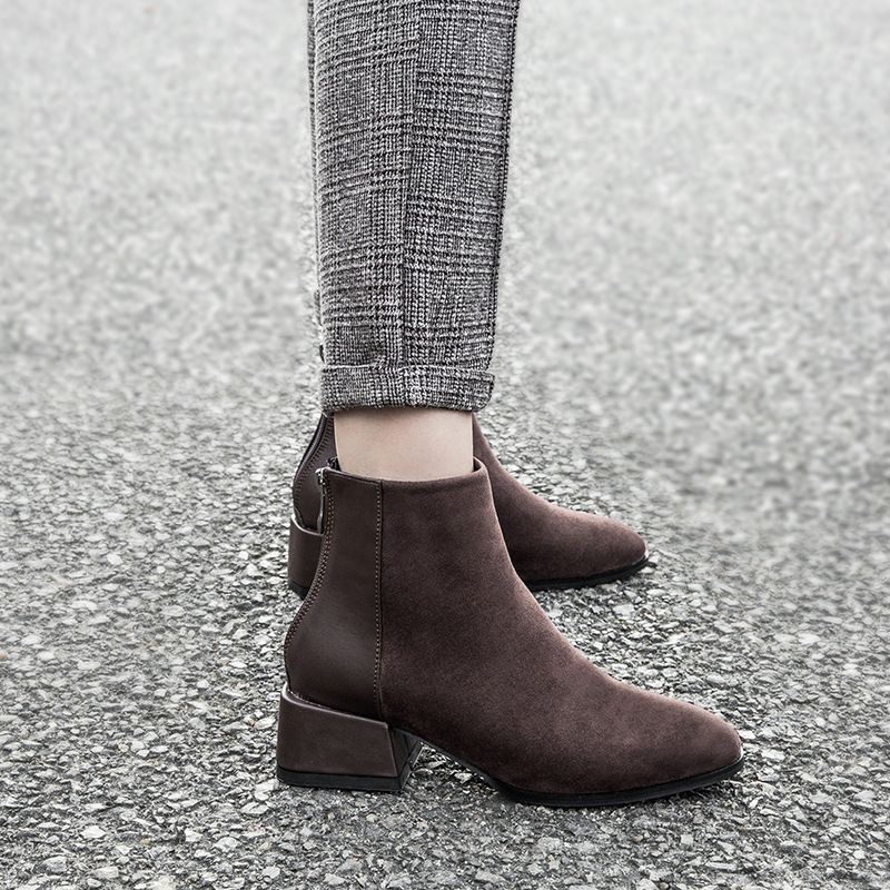 真皮3CM棕色马丁靴女圆头复古秋冬低筒靴切尔西靴粗跟加绒面短靴