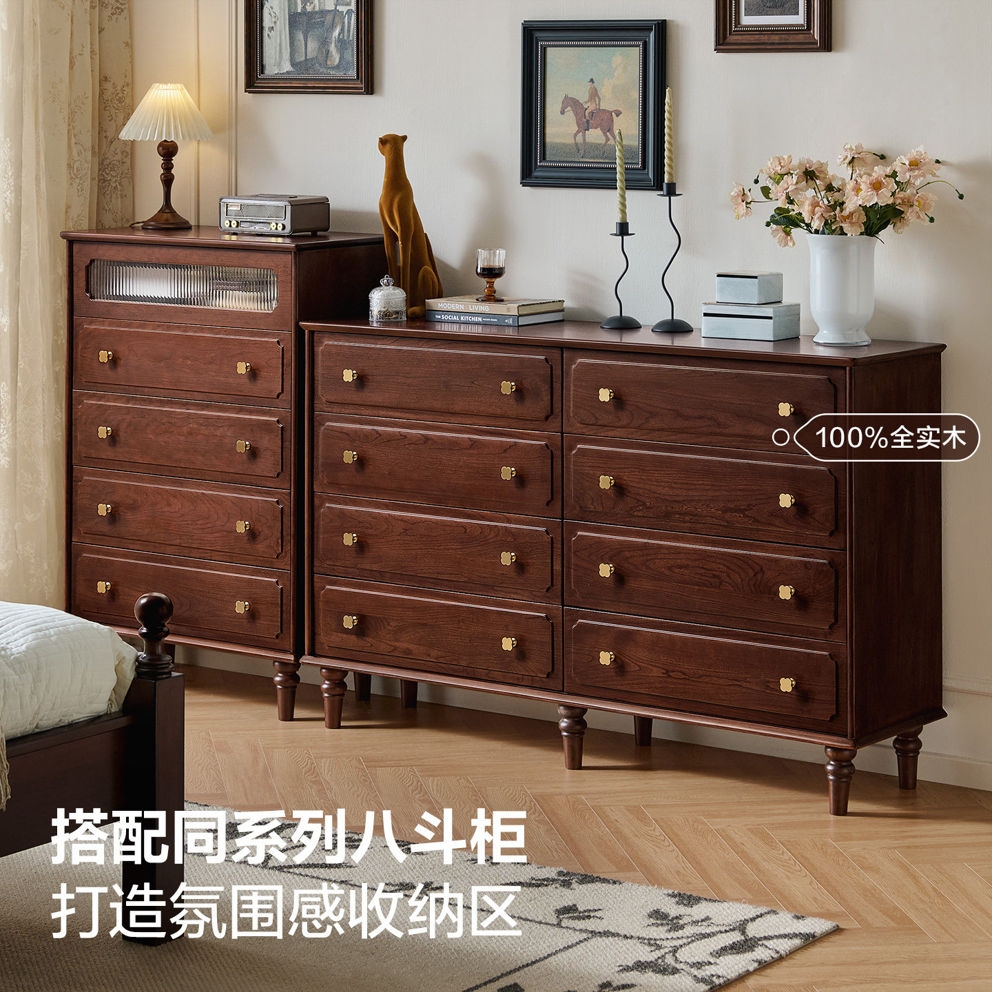 全友家居美式复古风五斗柜客厅家用抽屉柜卧室靠墙全实木储物柜