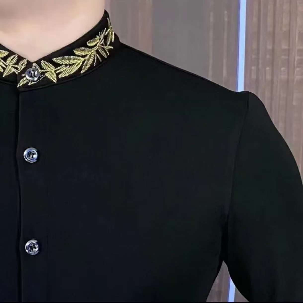 中国风潮流长袖衬衫男士秋冬季时尚刺绣加绒加厚衬衣立领保暖上衣