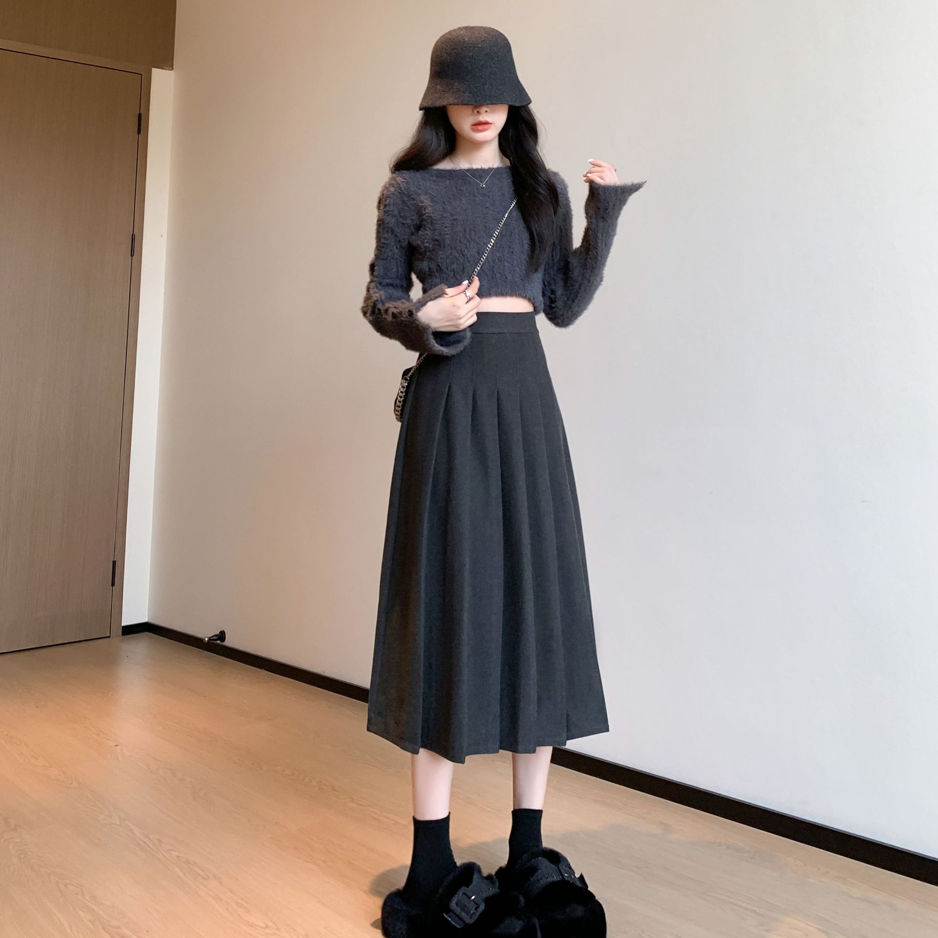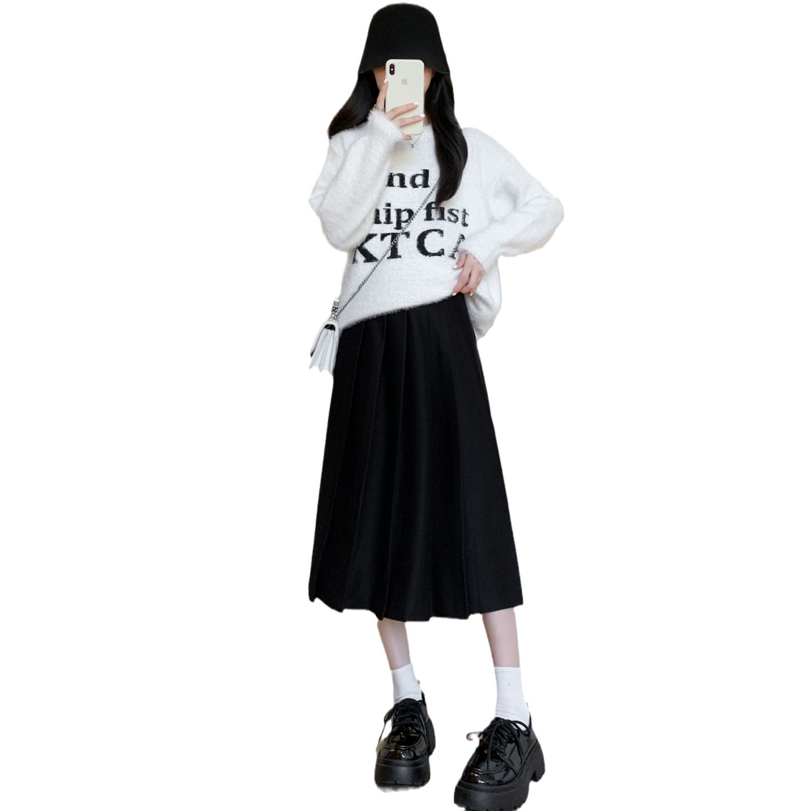 毛呢半身裙女秋冬新款加厚百褶裙松紧高腰显瘦宽松气质中长款半裙