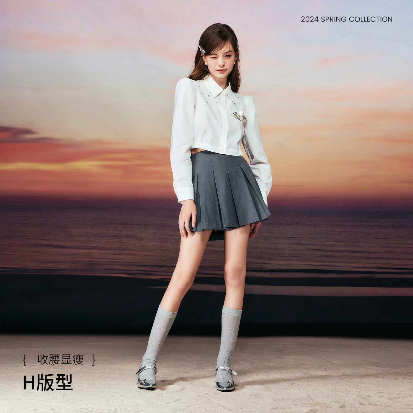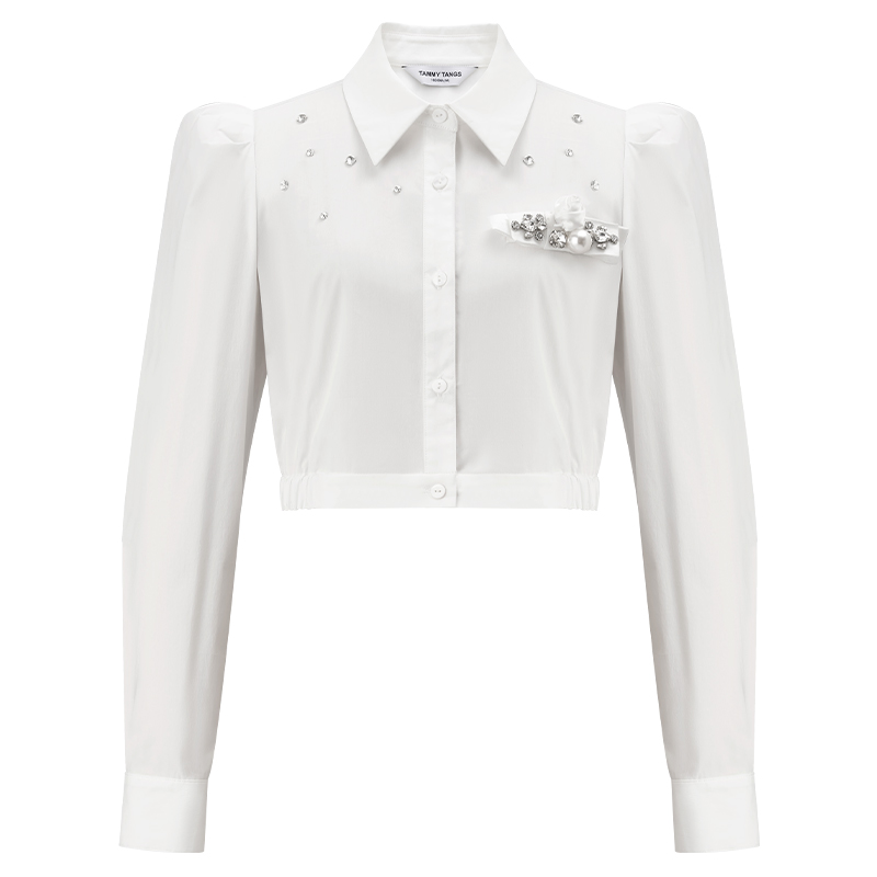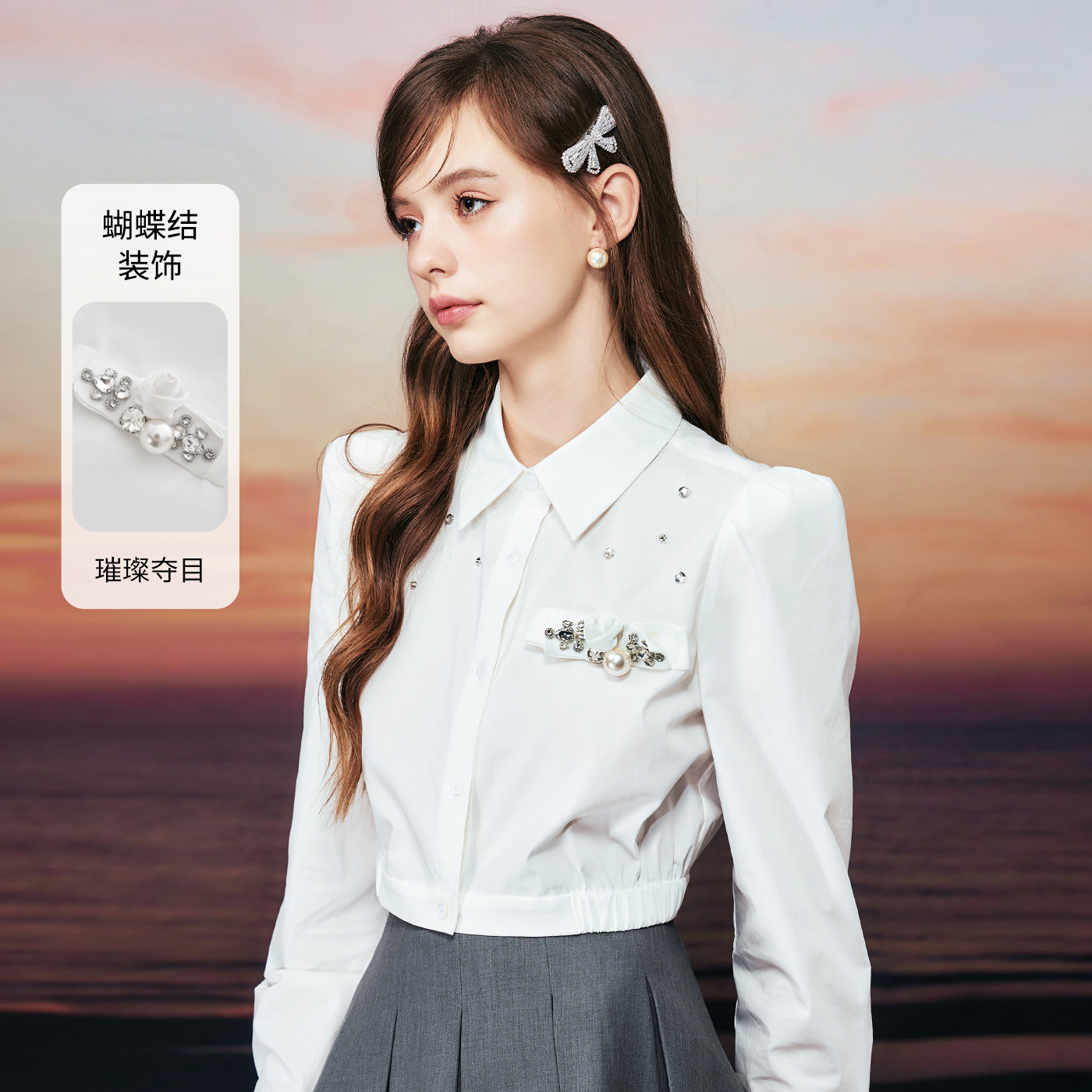 【商场同款】糖力春秋季白色衬衫女长袖手缝钻饰短款显瘦衬衣上衣