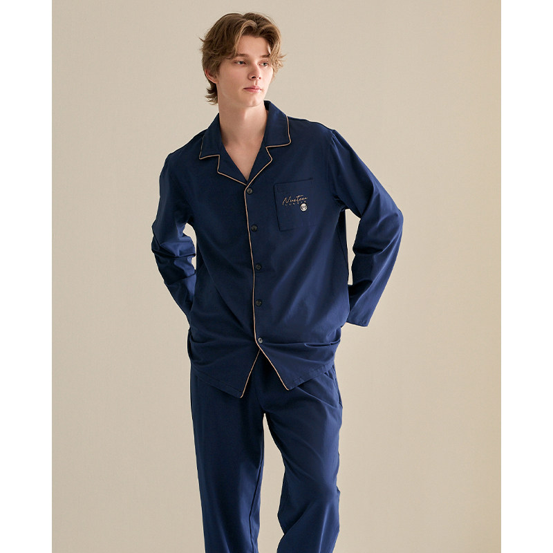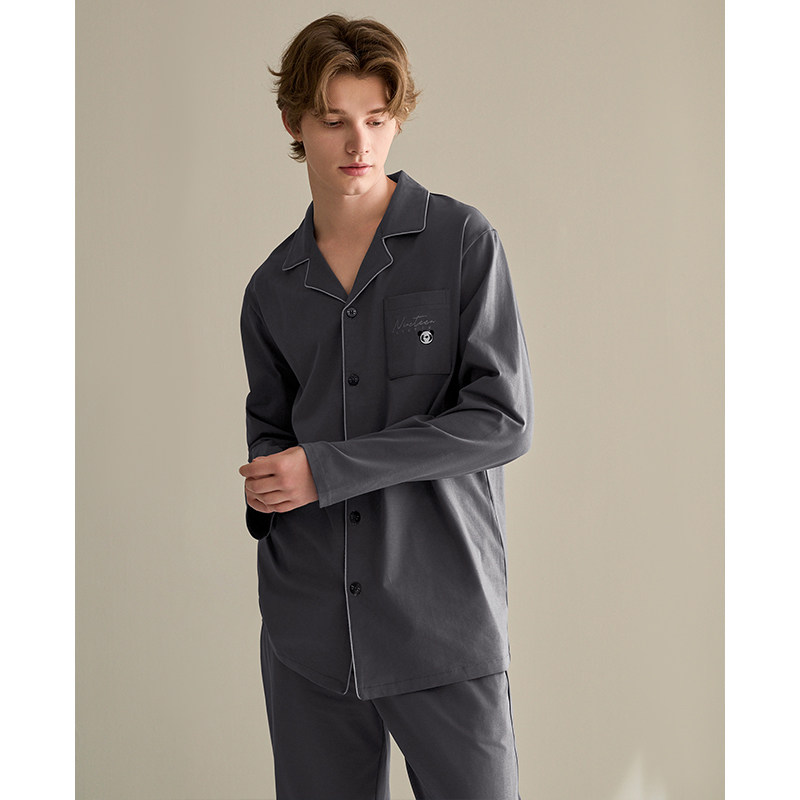 芬腾男士纯棉睡衣春秋季长袖开衫大码休闲男款全棉翻领家居服套装