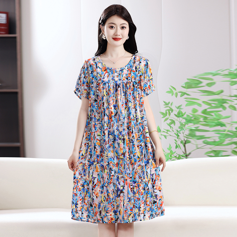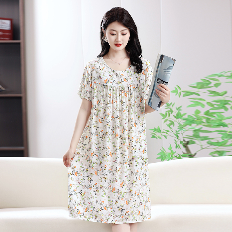 中老年妈妈夏季睡裙女中长款棉绸连衣裙人造棉宽松睡衣短袖家居服