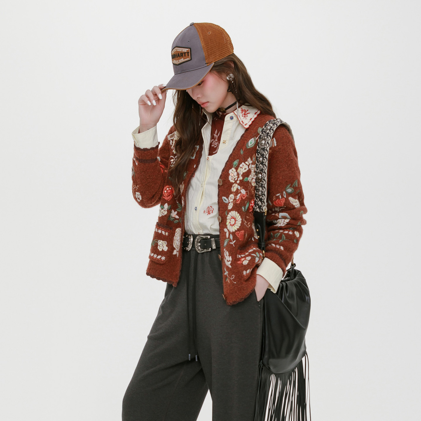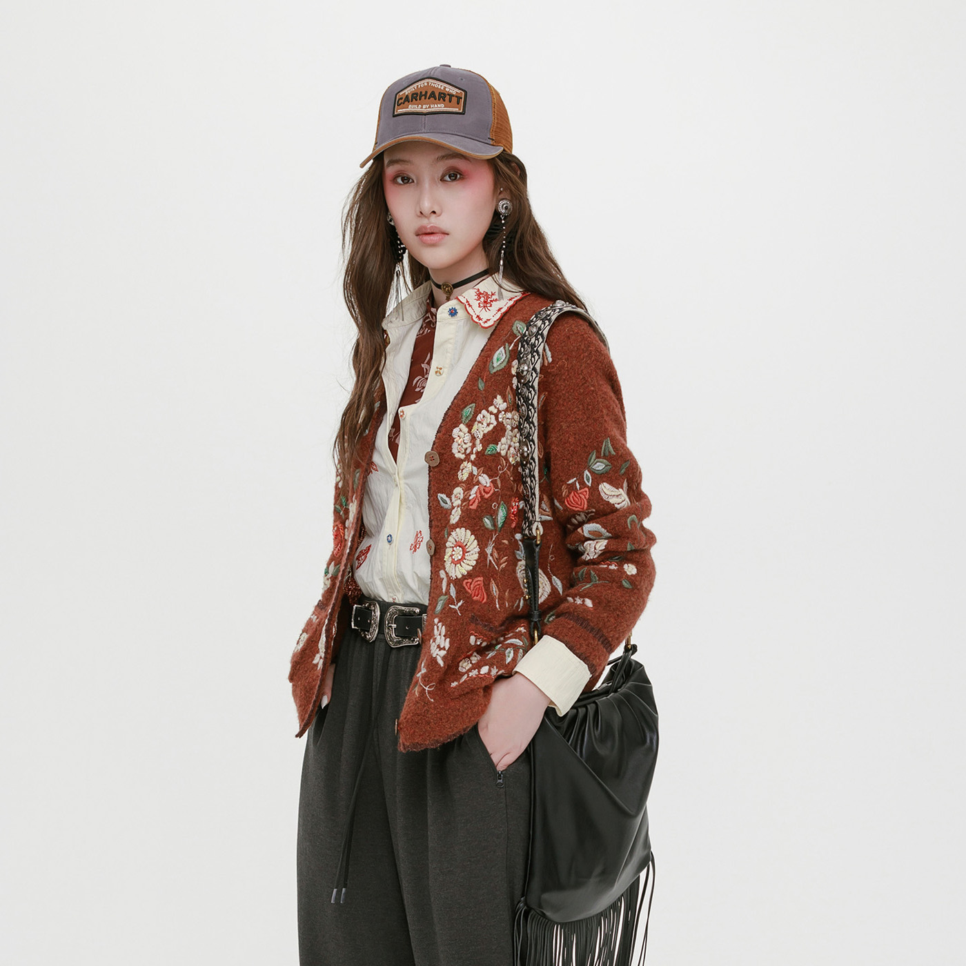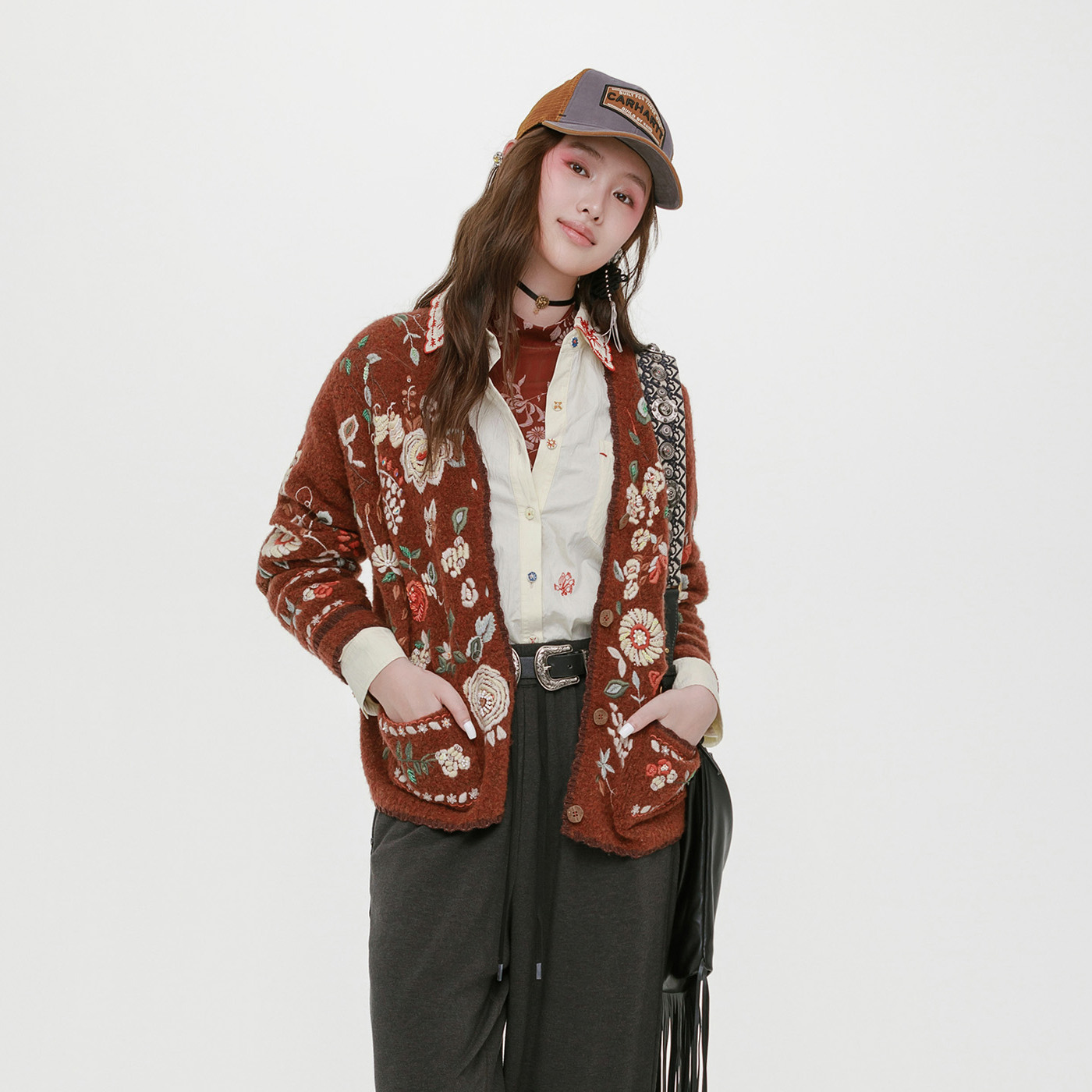 渔牌2025秋装新款立体刺绣绣花开衫文艺复古休闲毛针织外套女毛衫