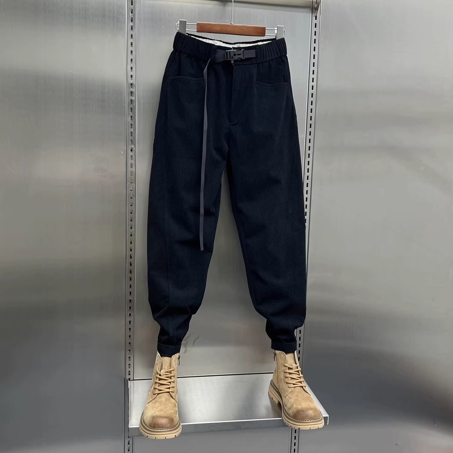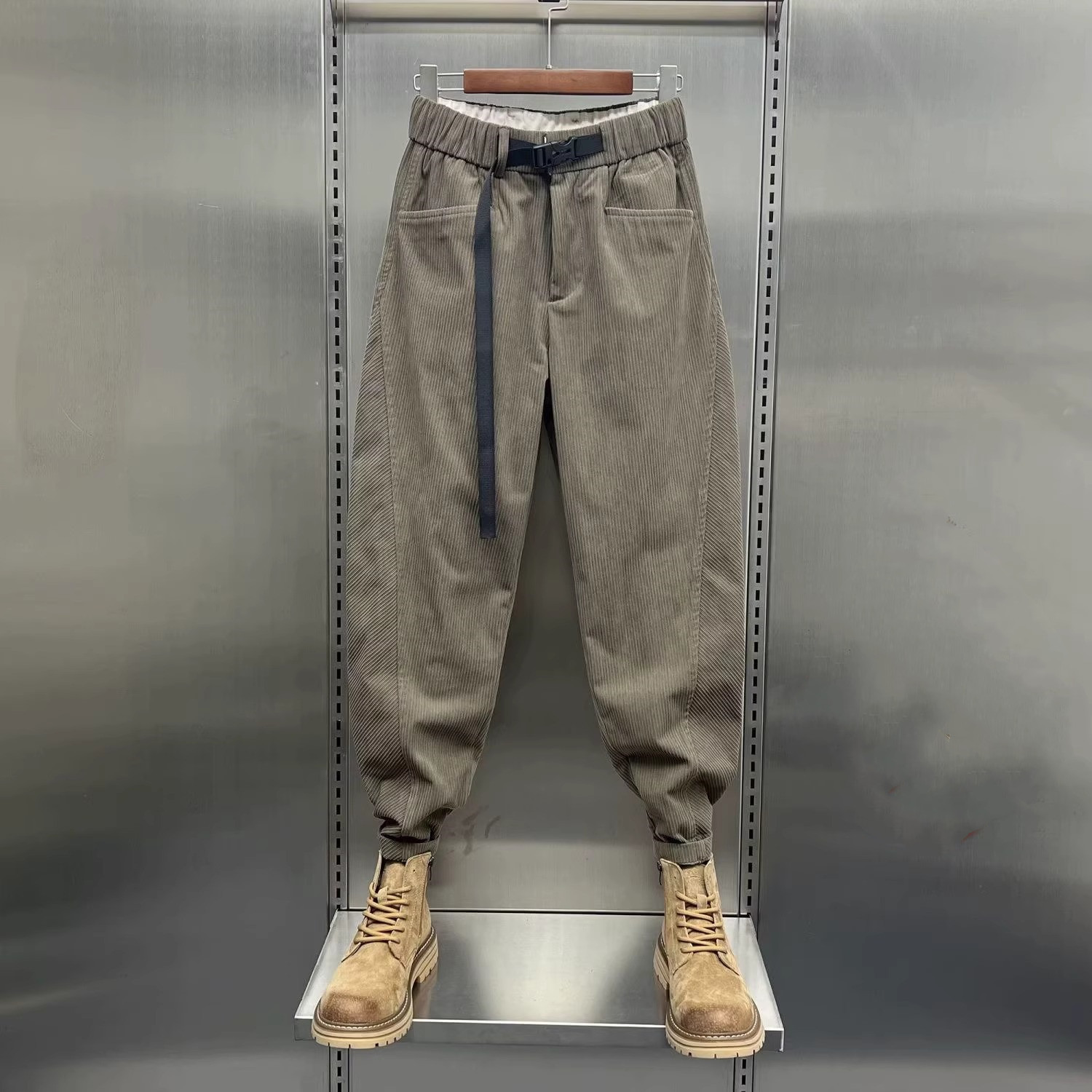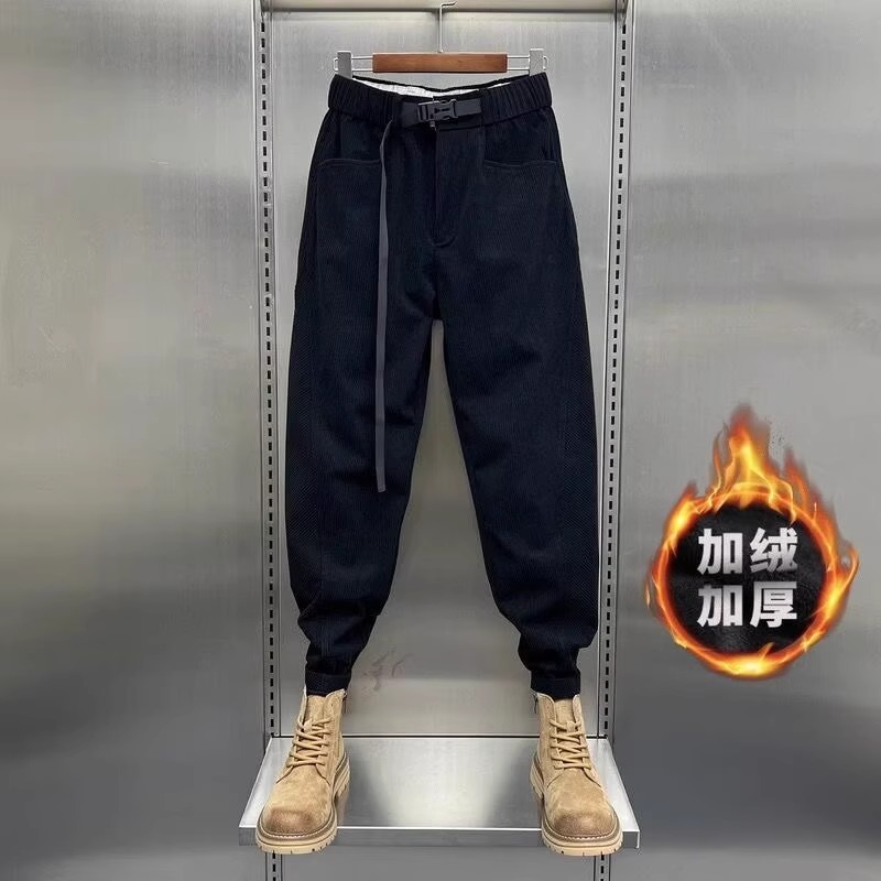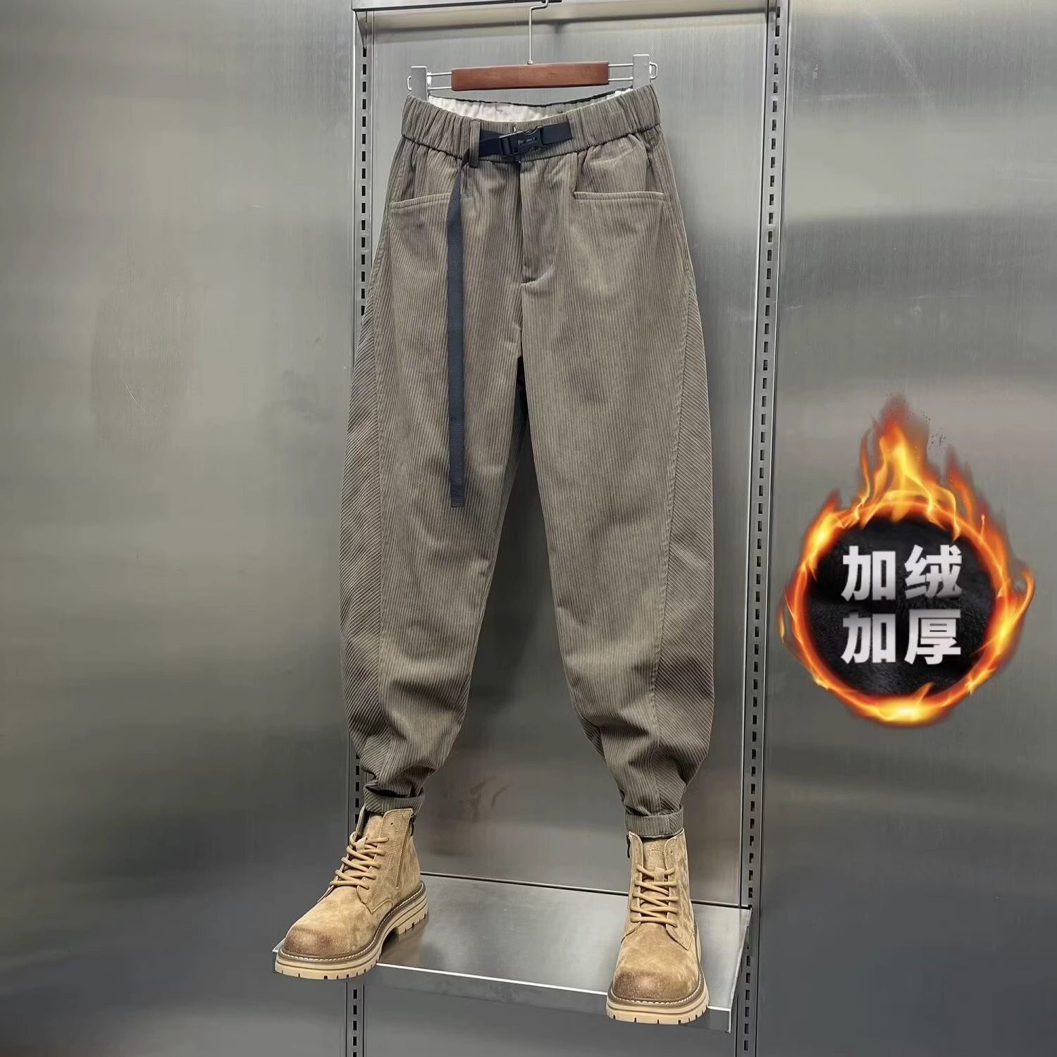 秋冬款加绒拼接灯芯绒休闲裤男士宽松直筒工装裤青年条绒哈伦裤子