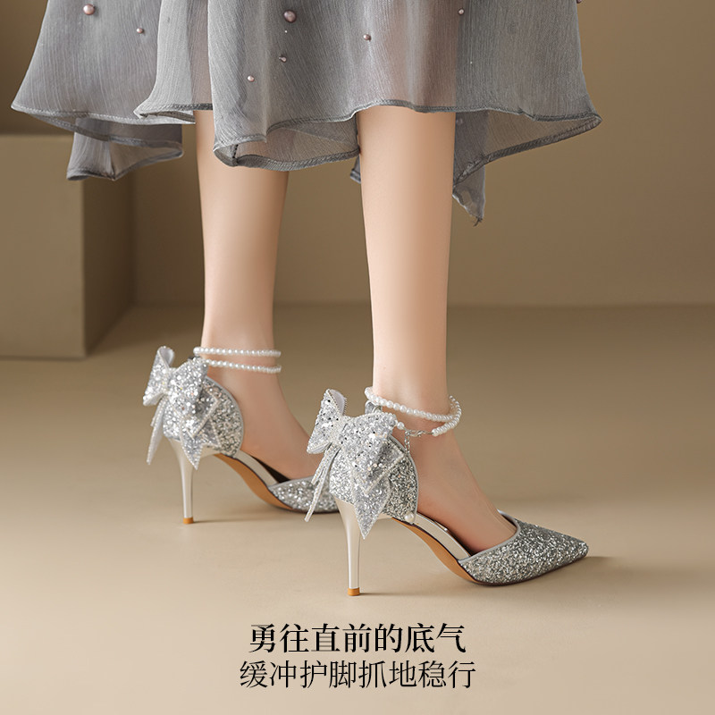 达芙妮高跟鞋女细跟2025新款夏季尖头婚鞋蝴蝶结单鞋气质凉鞋女款