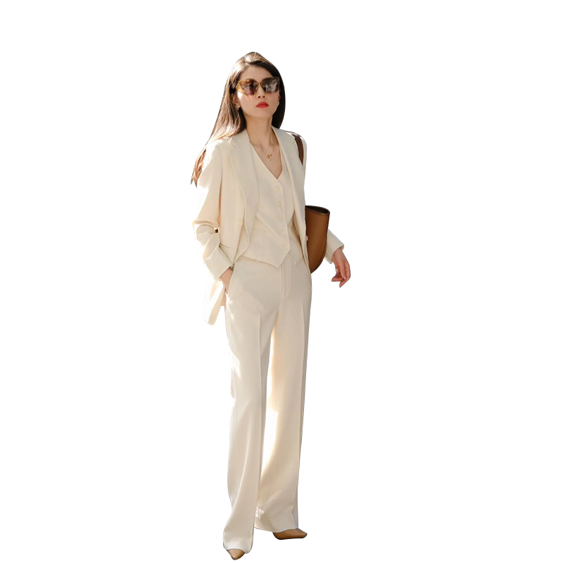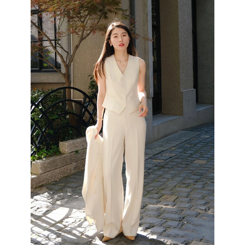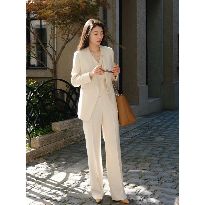 春秋新款月光白职业商务气质西服马甲三件套休闲阔腿裤西装套装女