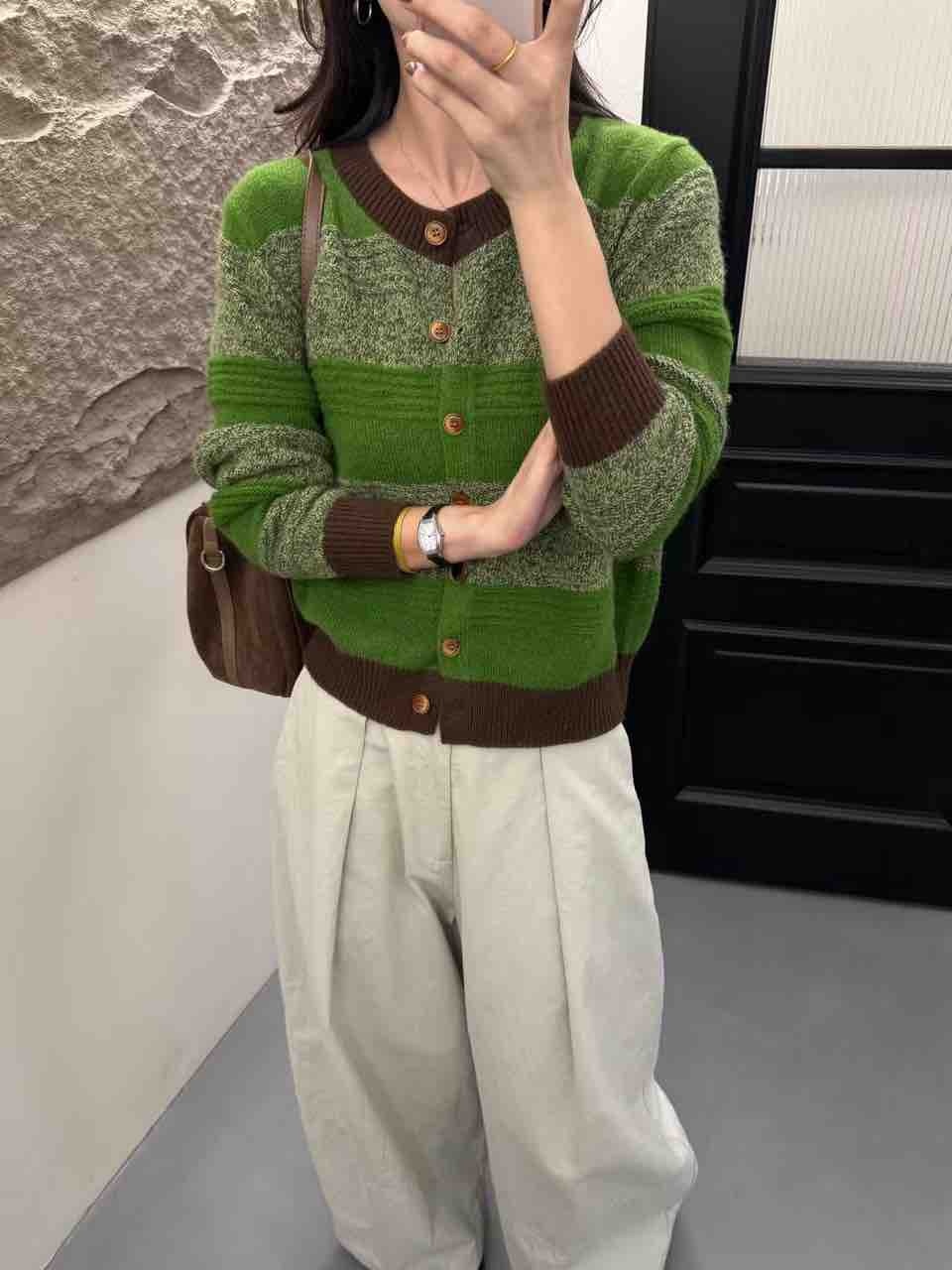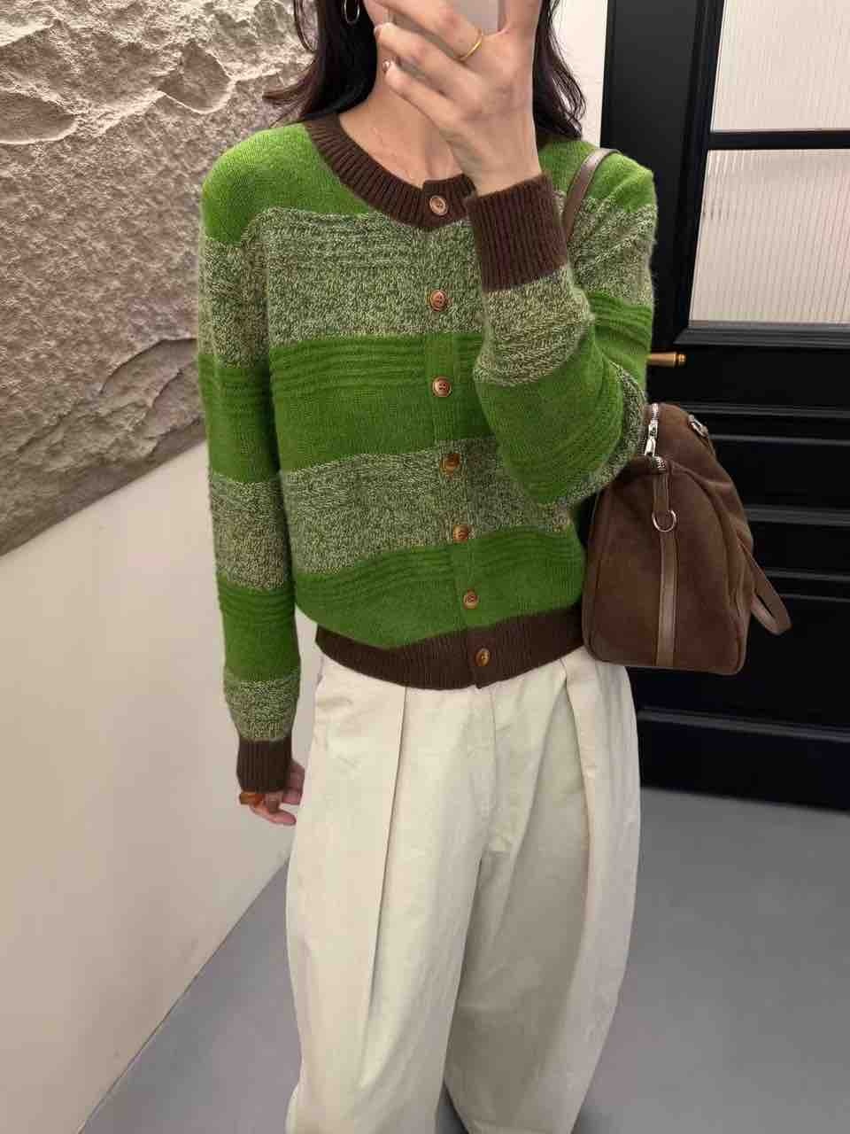 韩系高级感撞色条纹针织开衫女秋冬季2025新款复古软糯毛衣外套潮