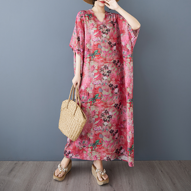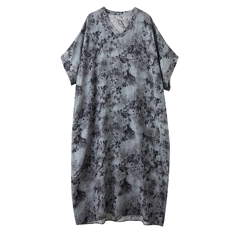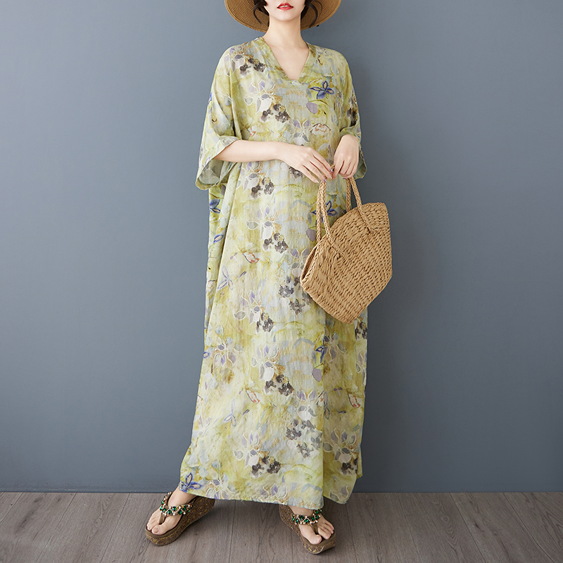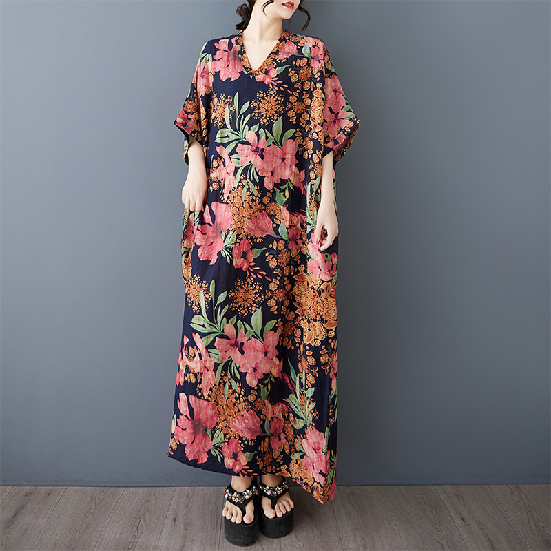 折扣捡漏外贸披发 夏季花色度假风旅游V领复古长裙遮肉棉麻连衣裙