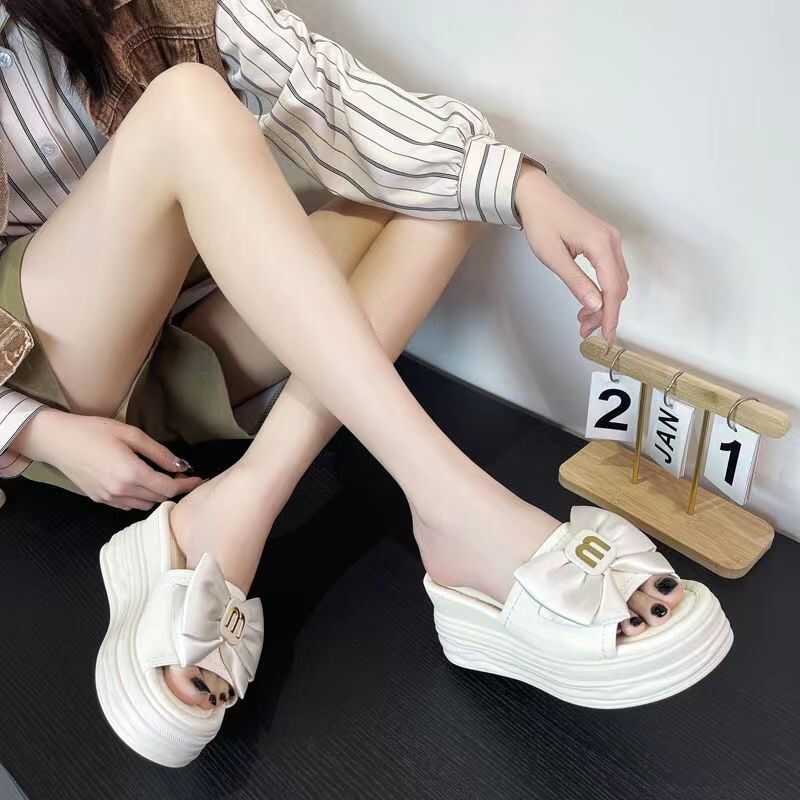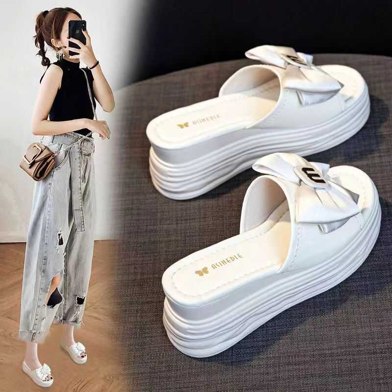 红青挺高跟凉拖女鞋夏季2024蝴蝶结装饰软底厚底沙滩防滑拖鞋韩版