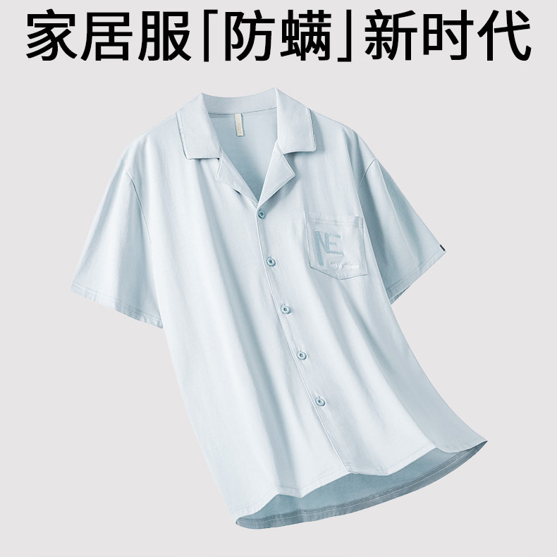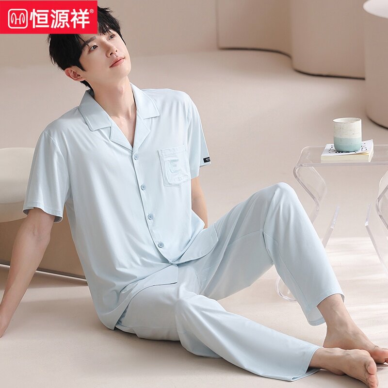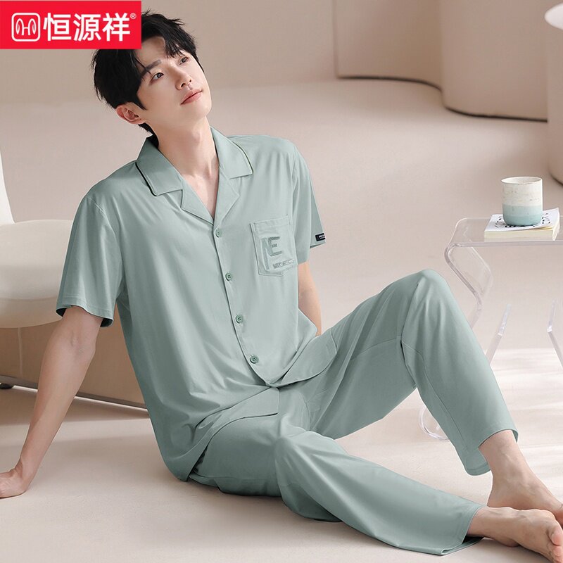 恒源祥男士春夏薄款衬衫领短袖长裤睡衣莱赛尔透气简约家居服套装
