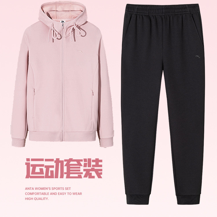 安踏运动套装女粉色2025新款春秋开衫连帽外套长裤休闲跑步两件套