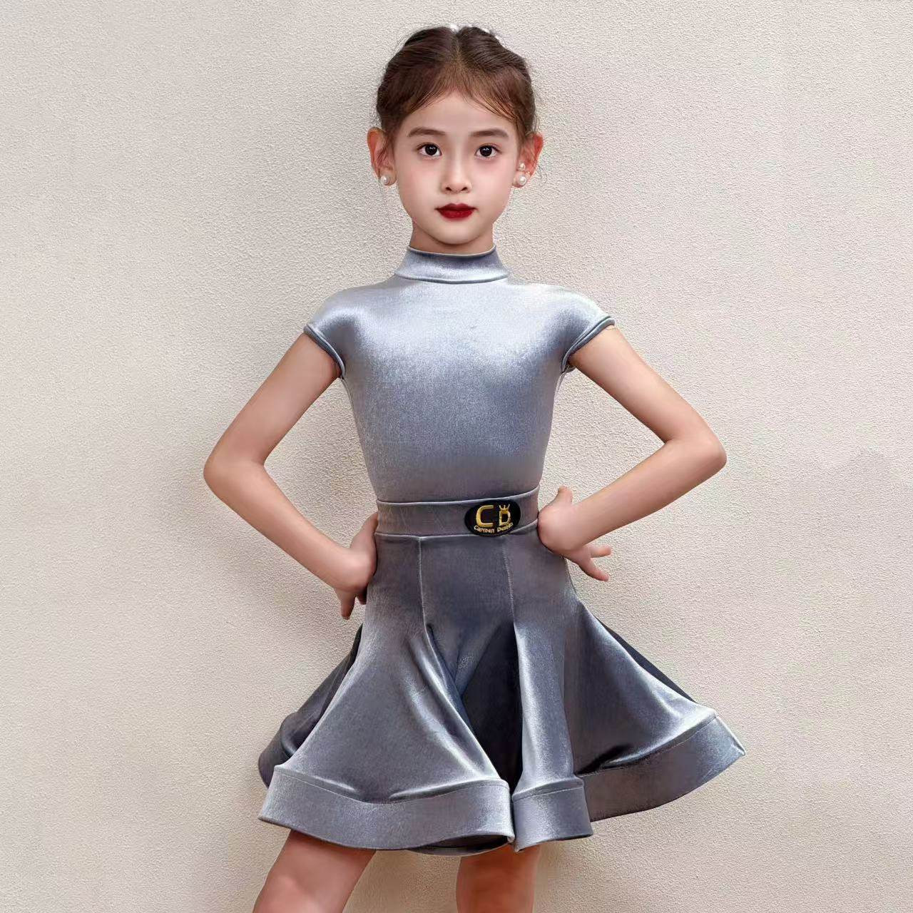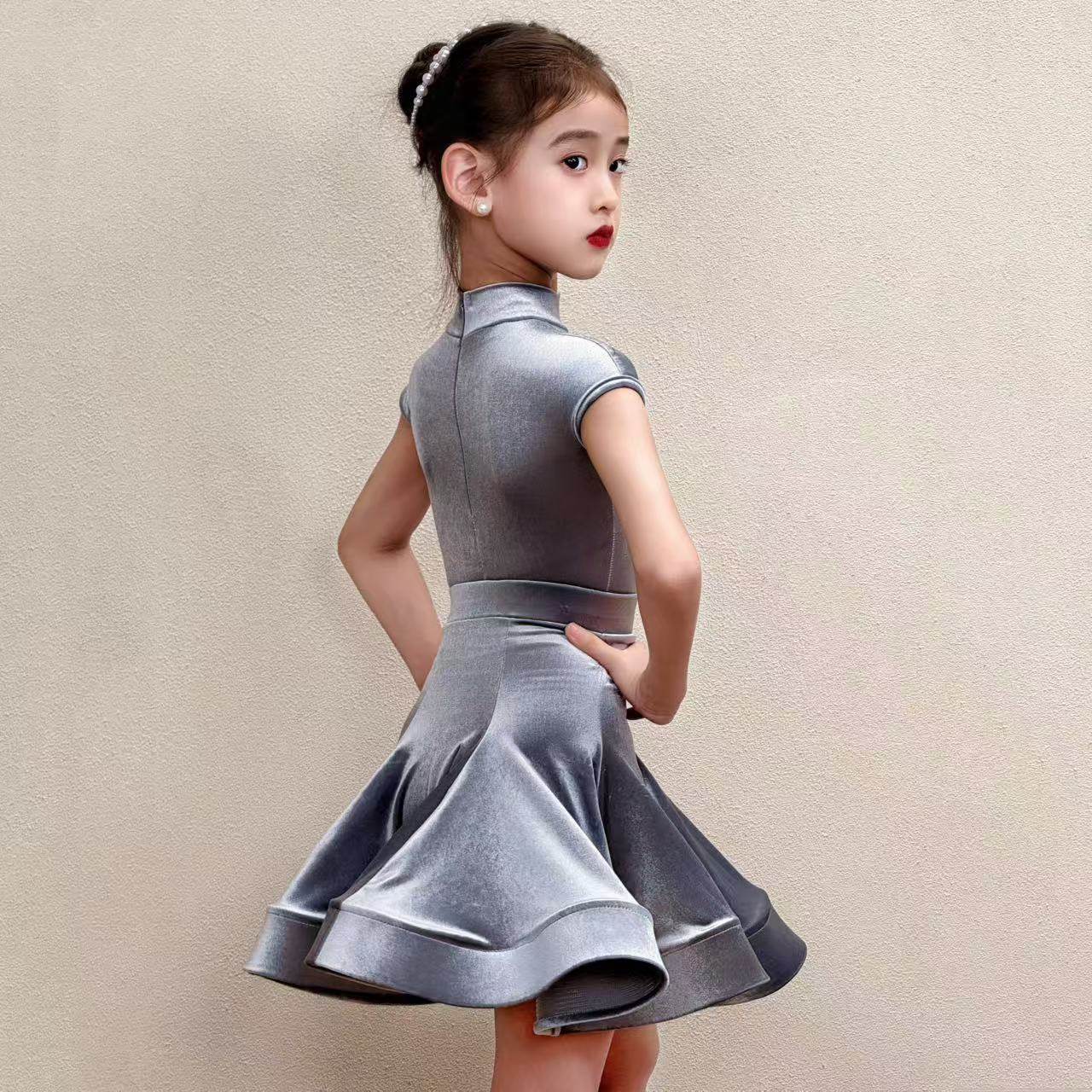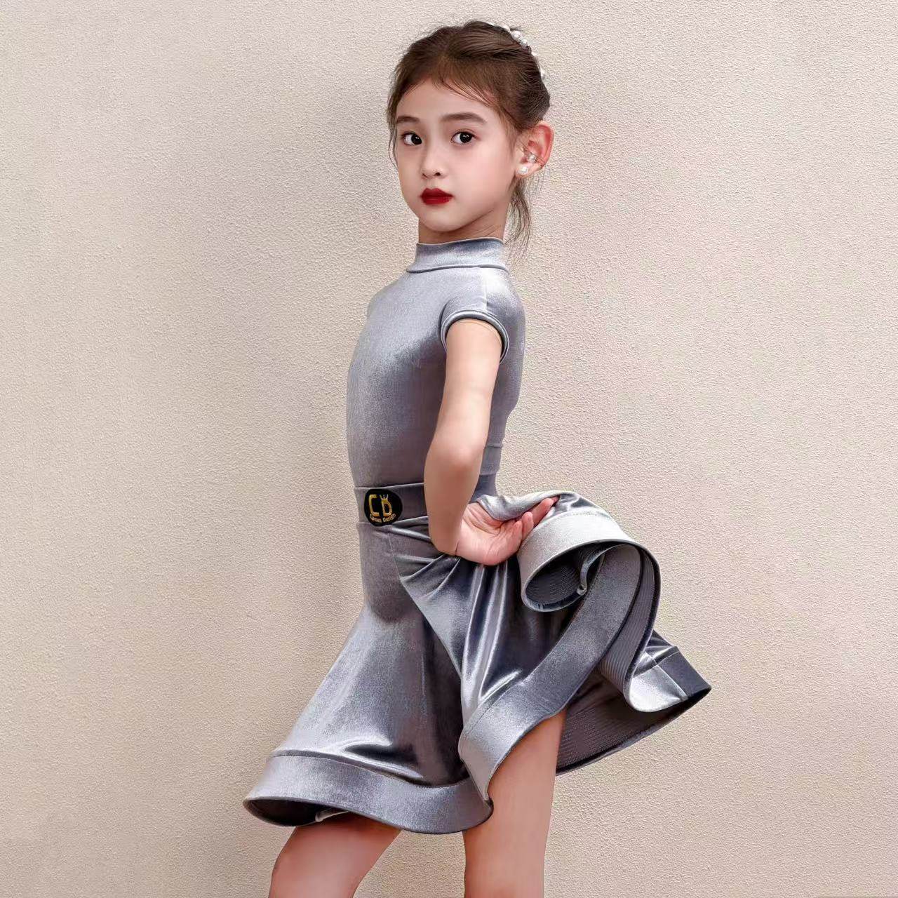 双十二CD卡门亮面丝绒灰短袖拉丁舞服女童考级专业比赛标准规定服