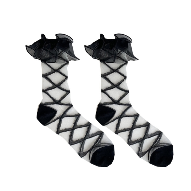 花边玻璃丝袜蕾丝袜子女薄款春夏中筒交叉条纹短袜可爱JK黑色袜子