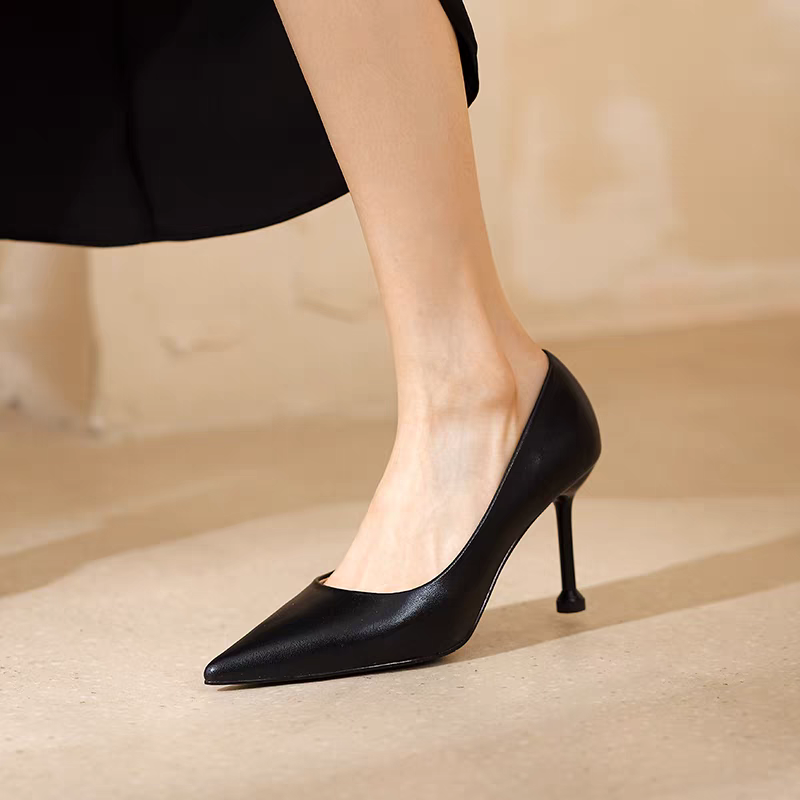 手工女鞋软羊皮黑色高跟鞋通勤尖头白色真皮一脚蹬气质单鞋