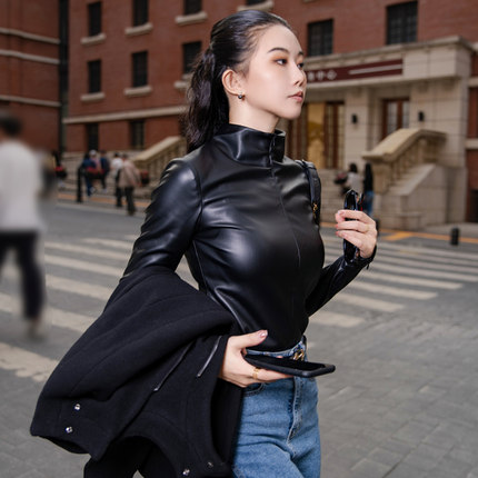 月影集黑色皮衣打底衫女秋冬薄绒高弹力修身机车外穿内搭紧身上衣