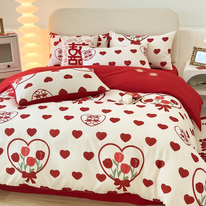 中式婚庆四件套大红色t床单被套全棉结婚床上用品新婚喜