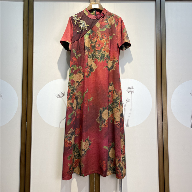 真丝香云纱连衣裙重磅珍珠缎古典印花宽松桑蚕丝裙改良旗袍