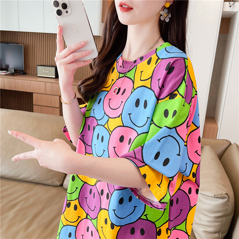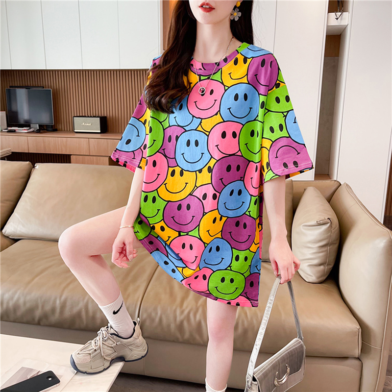 小众圆领t恤女宽松慵懒风大码短袖洋气复古ins设计感中长款上衣