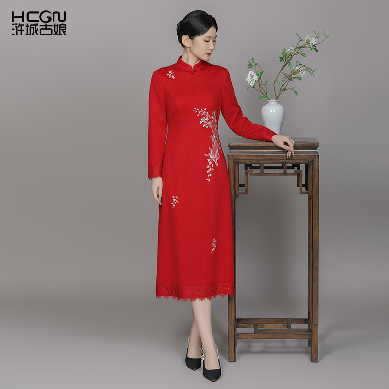浒城古娘新款刺绣气质立领红色长袖新中式国风旗袍连衣裙女款春秋