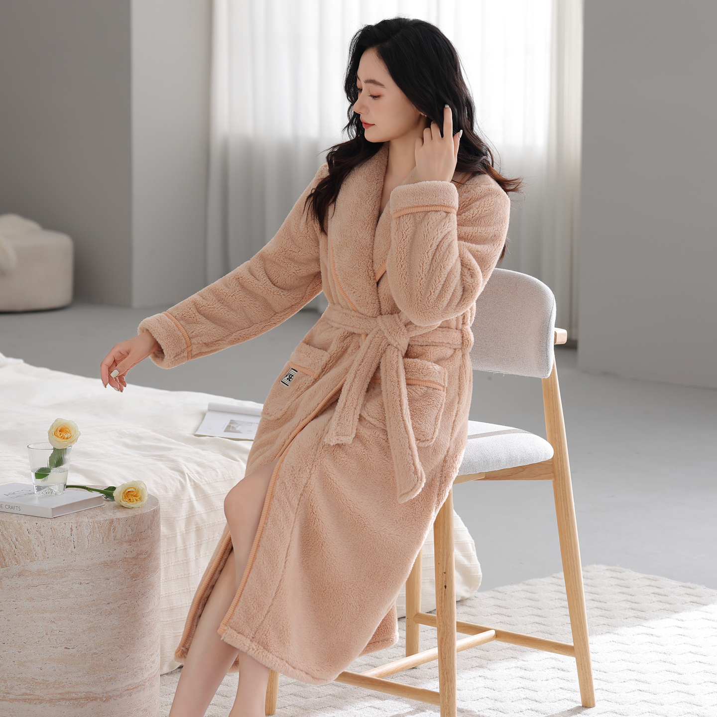 女士法兰绒睡袍简约保暖加绒冬天珊瑚绒浴袍加厚居家服休闲款睡衣