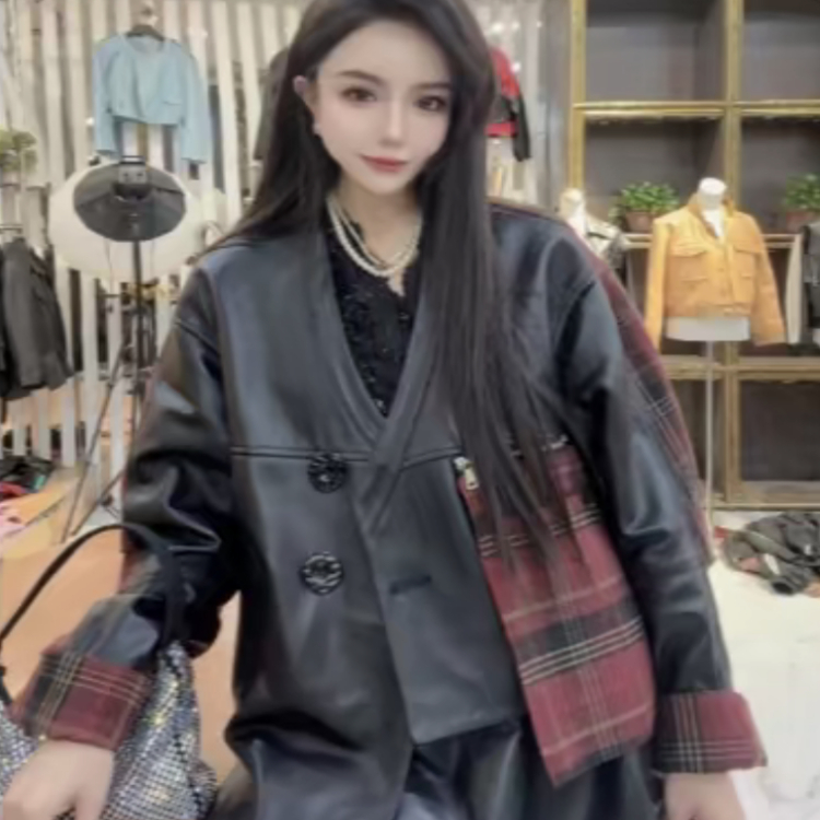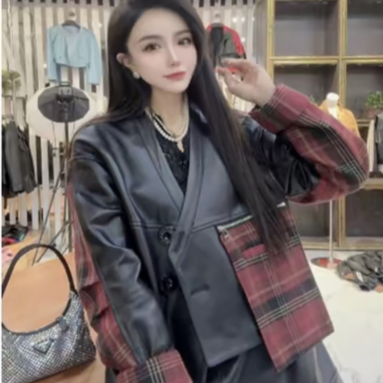 欧港妮2025春季新款真皮皮衣女短款立领拼色绵羊皮夹克外套宽松潮