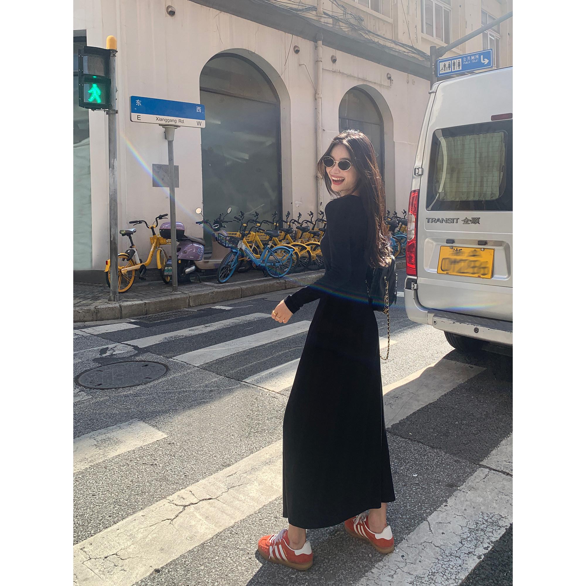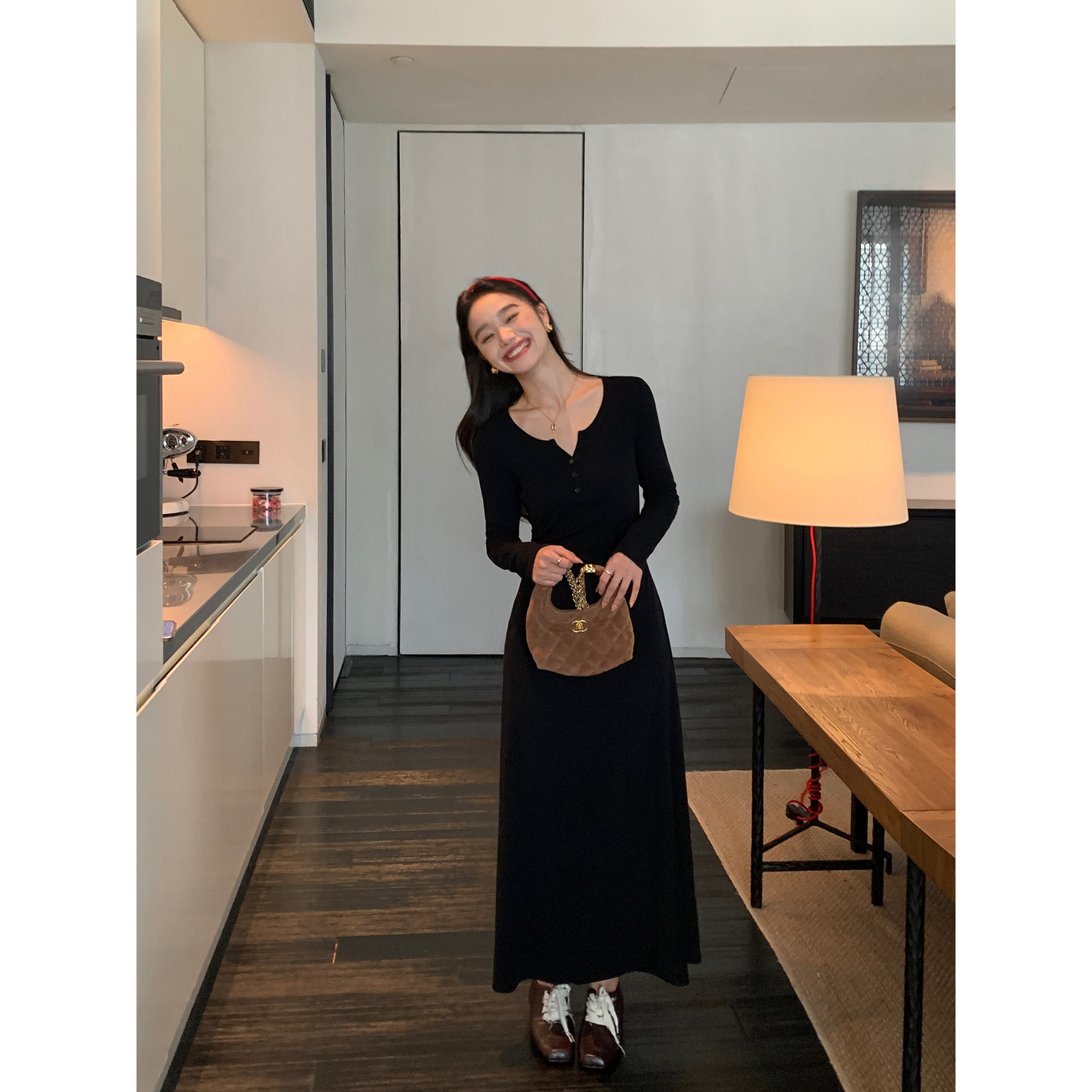 pusumede 秋日报刊 黑色长袖针织连衣裙女气质收腰修身打底长裙子