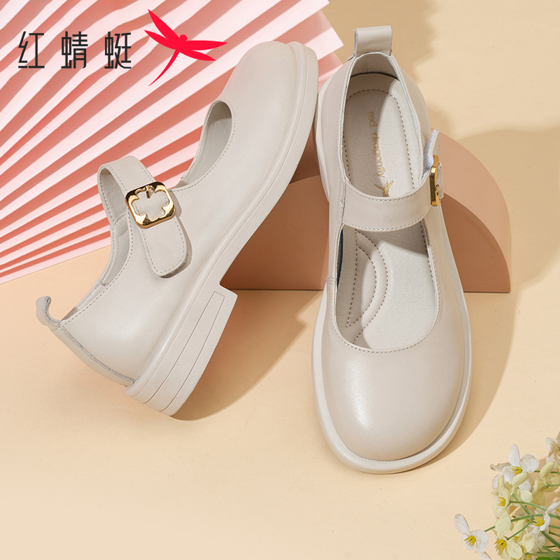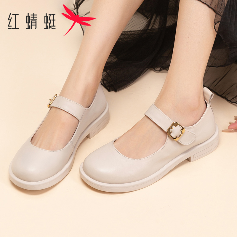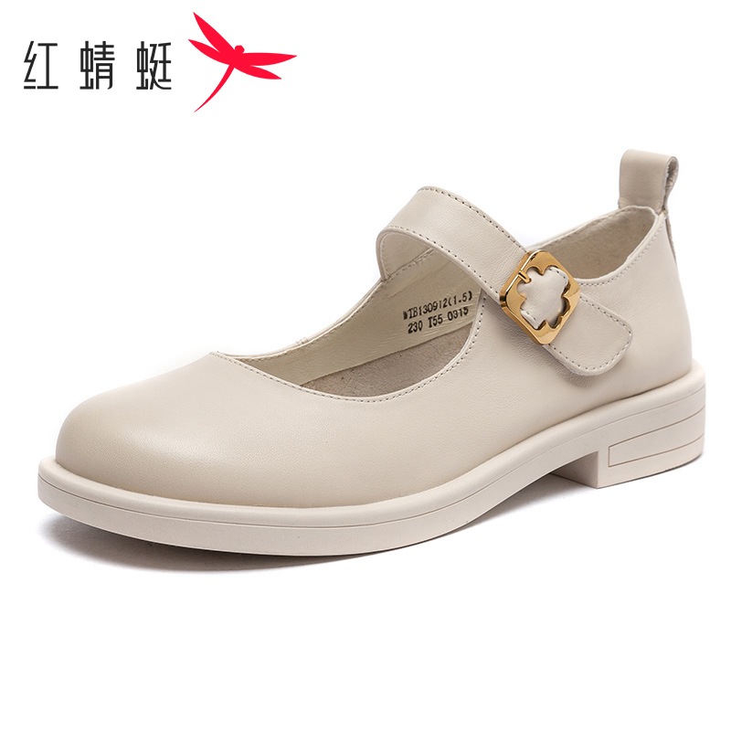 红蜻蜓玛丽珍女鞋秋季圆头浅口平跟休闲单鞋一字扣真皮中年妈妈鞋