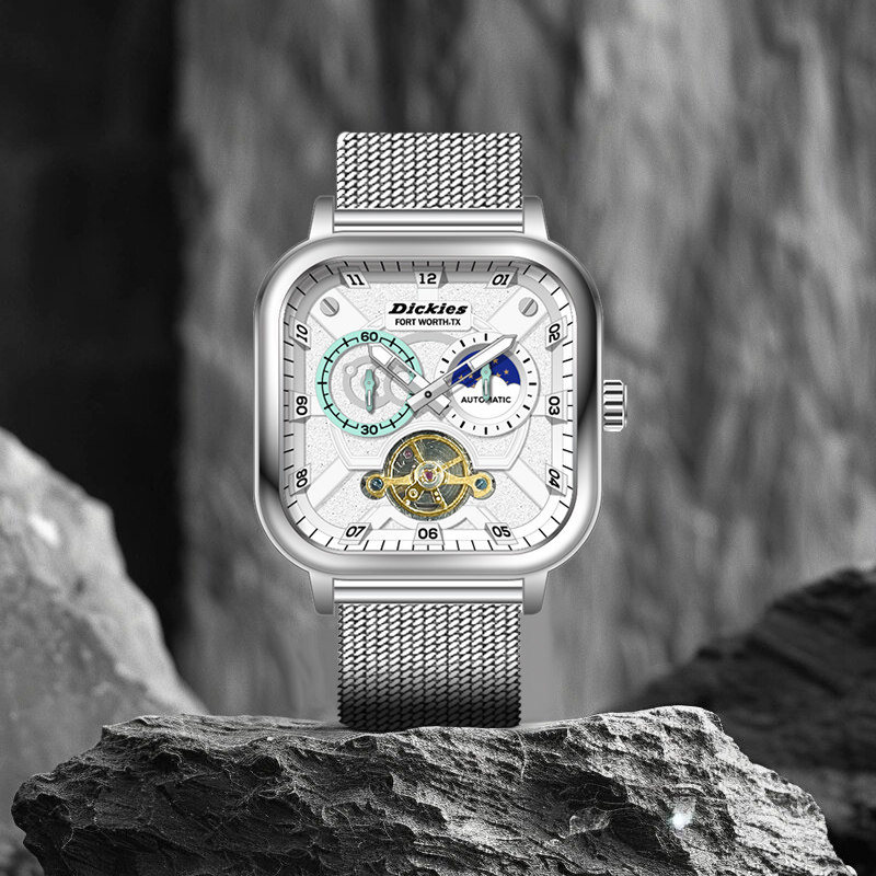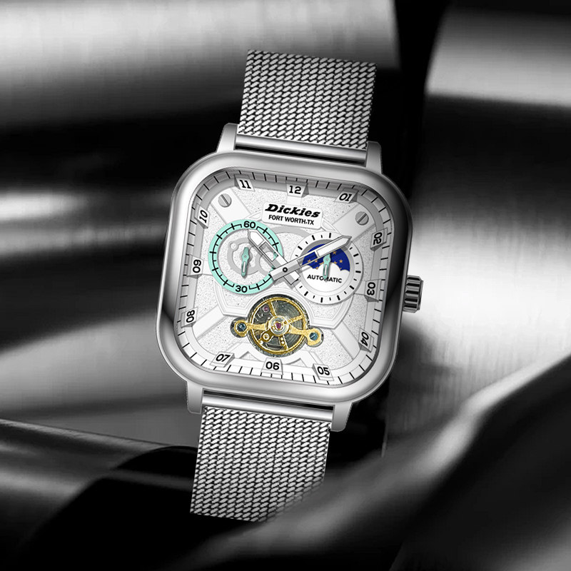 Dickies手表男方形全自动机械表防水夜光陀飞轮日月星象钢带腕表